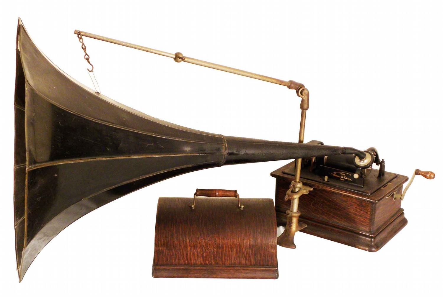 Very Rare Edison Suitcase Model # H17196. Two minute cylinder with large Morning Glory Horn. Last patent date May 31, 1898. Table top model with original oak case and handled lid. Excellent original working condition. Horn measures 22 inches in diameter.