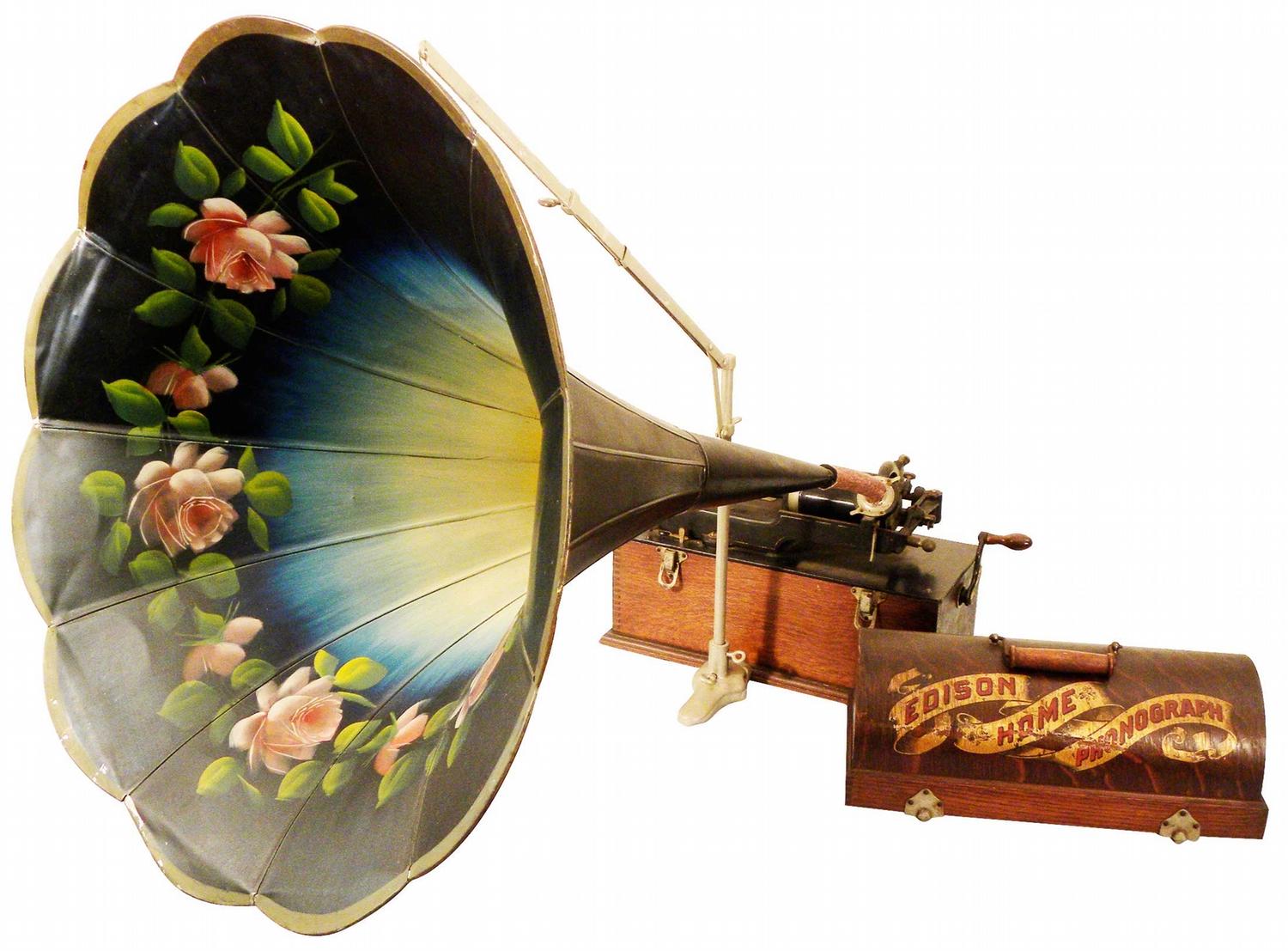 Very Rare Edison Suitcase Model # H17196. Two minute cylinder with large Morning Glory Horn. Last patent date May 31, 1898. Table top model with original oak case and handled lid. Excellent original working condition. Horn measures 23 inch diameter.