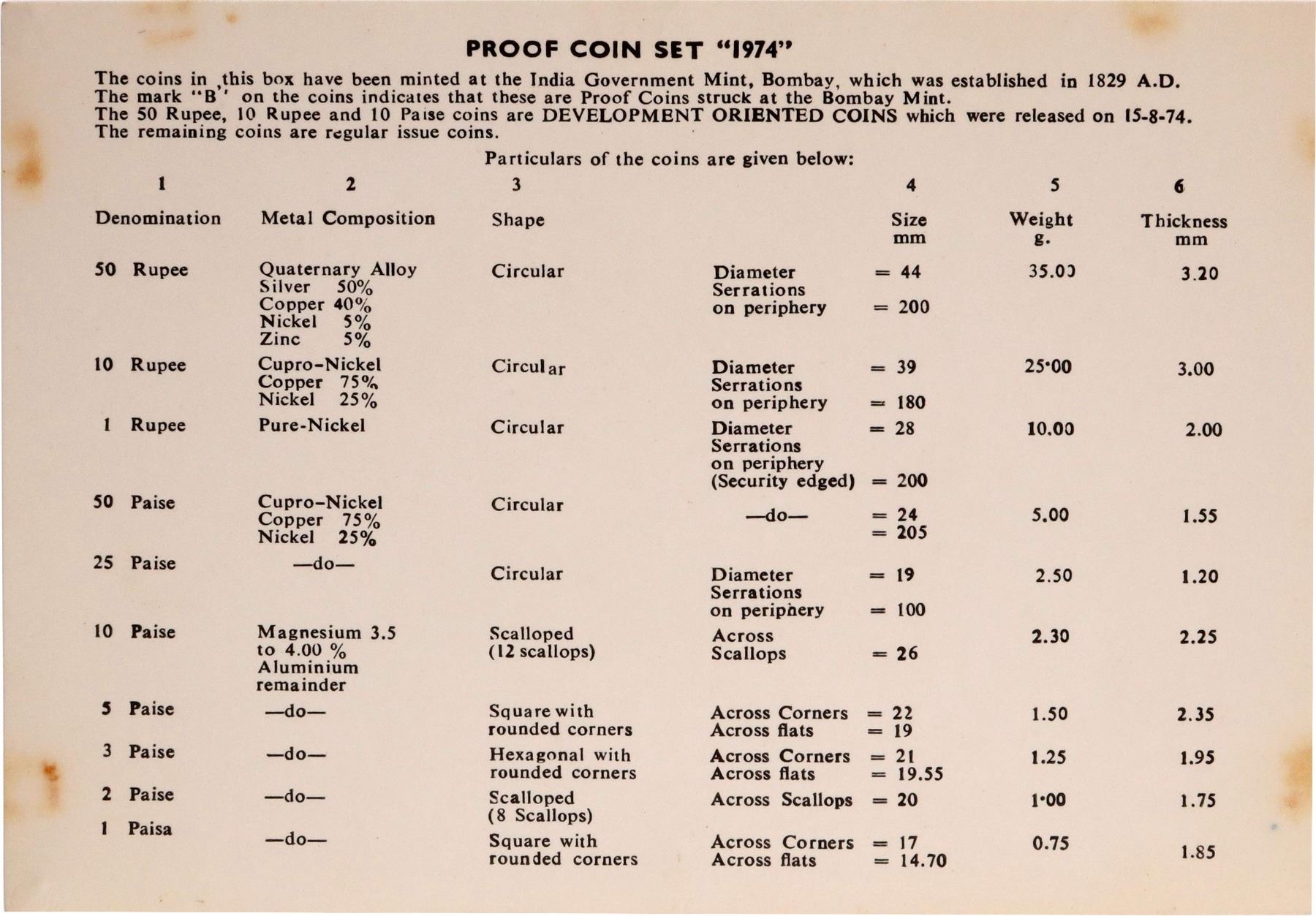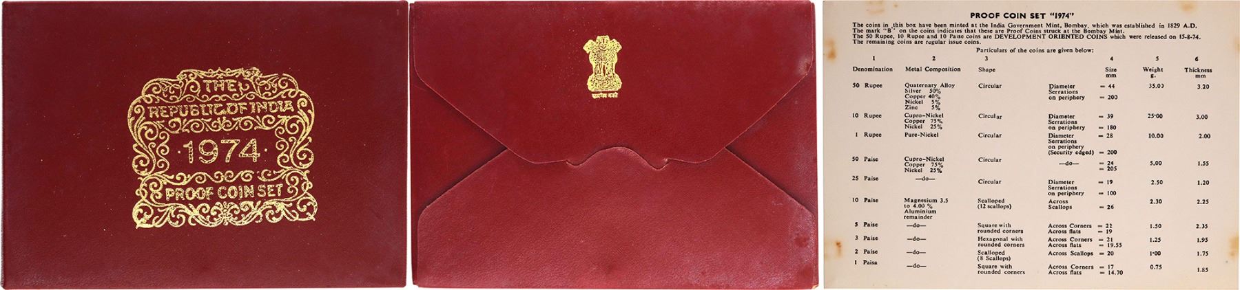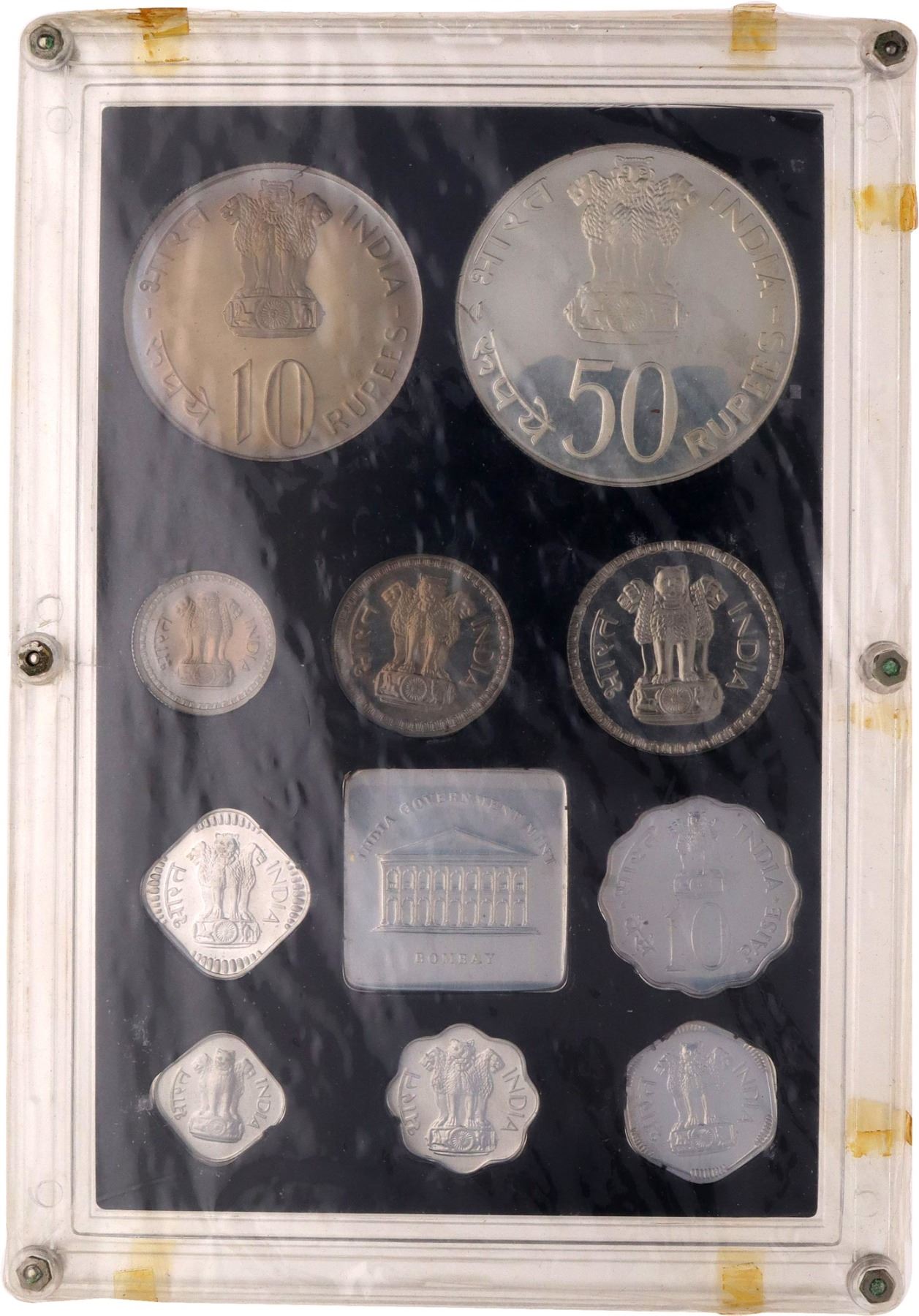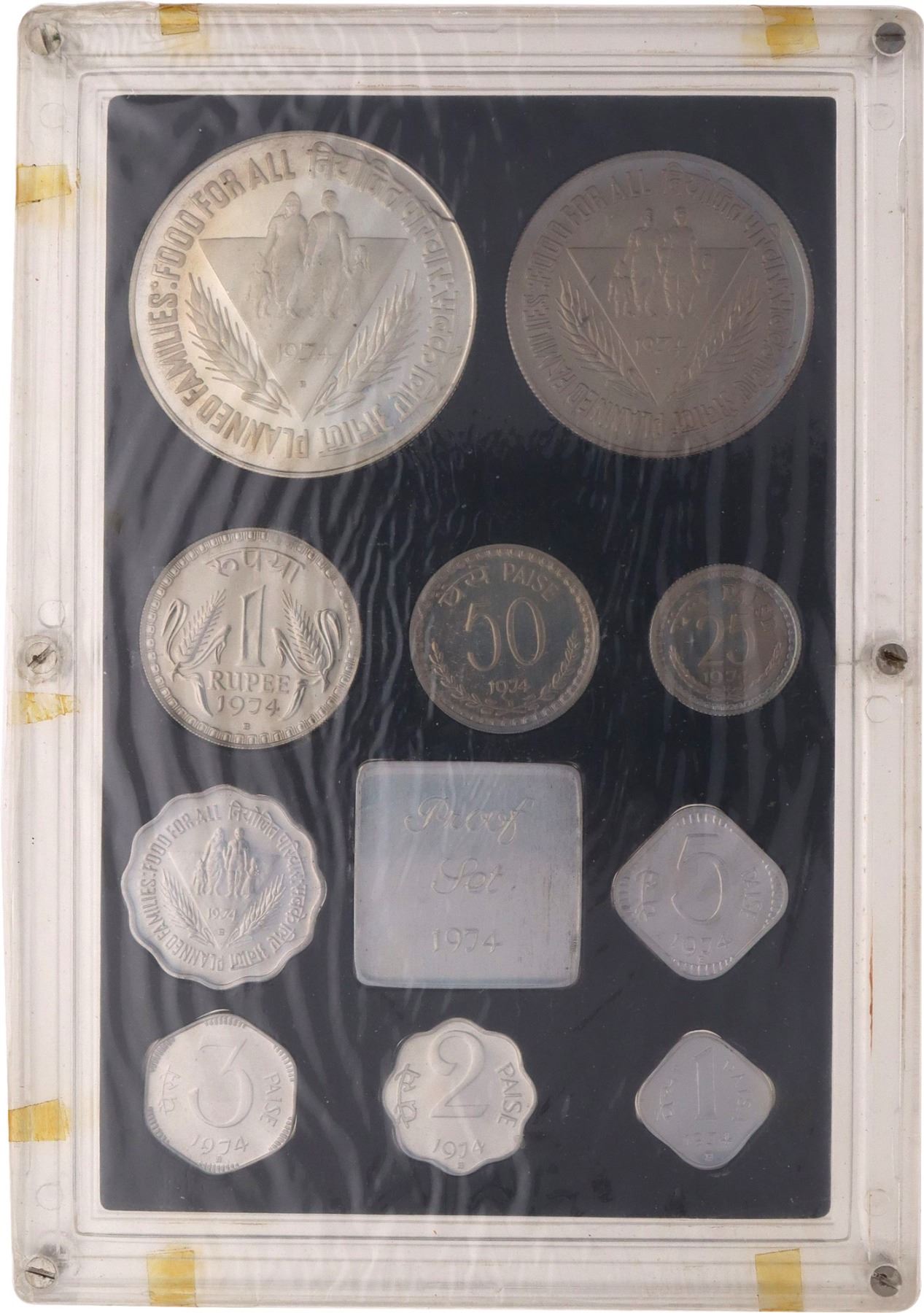 Republic India, 1974, Proof Set, F.A.O - Planned Families, Set of 10 Coins, 50 Rupees, 10 Rupees, 1 Rupee, 50 Paise, 25 Piase, 10 Paise, 5 Paise, 3 Paise, 2 Paise & 1 Paisa, Bombay Mint, (RB # 41), intact in an acrylic case with mint emblem, preserved in outer cover with certificate, proof, Very Rare.
