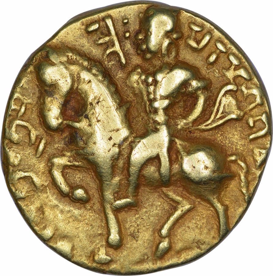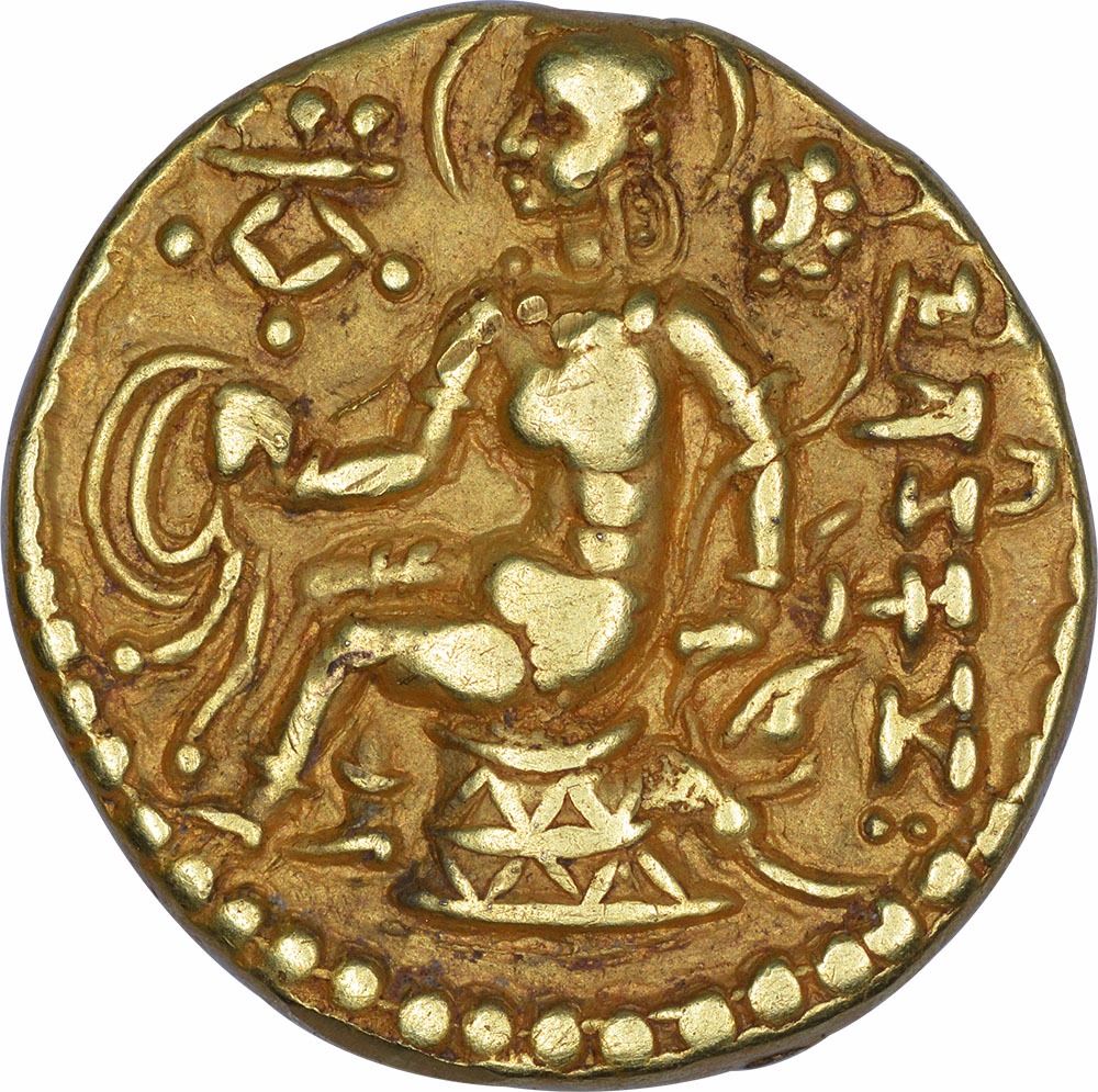 Gupta Dynasty, Chandragupta-II "Vikramaditya", Gold Dinar, Horseman Type. Obv:king riding horse to left, holding bow and sword tied to the waist, brahmi legend around"Paramabhagavato (Maharajadhira)ja Sri Chandragupta", Rev:goddess lakshmi seated facing left on wicker stool, holding long stemmed lotus, royal tamgha at left, brahmi legend at right "Ajitavikrama",(Altekar, Bayana # Pl. XII-11),7.70g, 18.50mm,about extremely fine+,VeryRare.