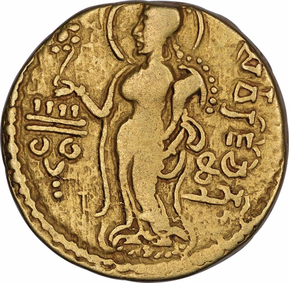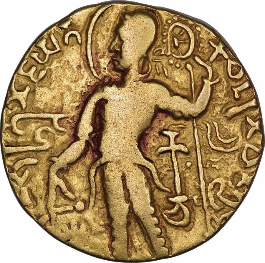 Gupta Dynasty, Samudragupta (335-380 AD), Gold Dinar, Kacha type, Var. A, Obv: king nimbate standing to left, holding a wheel-headed standard in his left hand, brahmi legend "Kacho Gamavajatya Divam""Karmabhiruttamair jayati" (having conquered the earth, Kacha wins the heaven by excellent deeds) in the right field and 'Kacha' written vertically below the king’s elbow, Rev: goddess lakshmi standing to left holding a cornucopia with brahmi legend "Sarvarajochchhetta" (exterminator of all kings) in the right field,7.60g, 20.06mm,(Altekar, Bayana # Pl. VI-14), about extremely fine with almost complete legends, VeryRare.