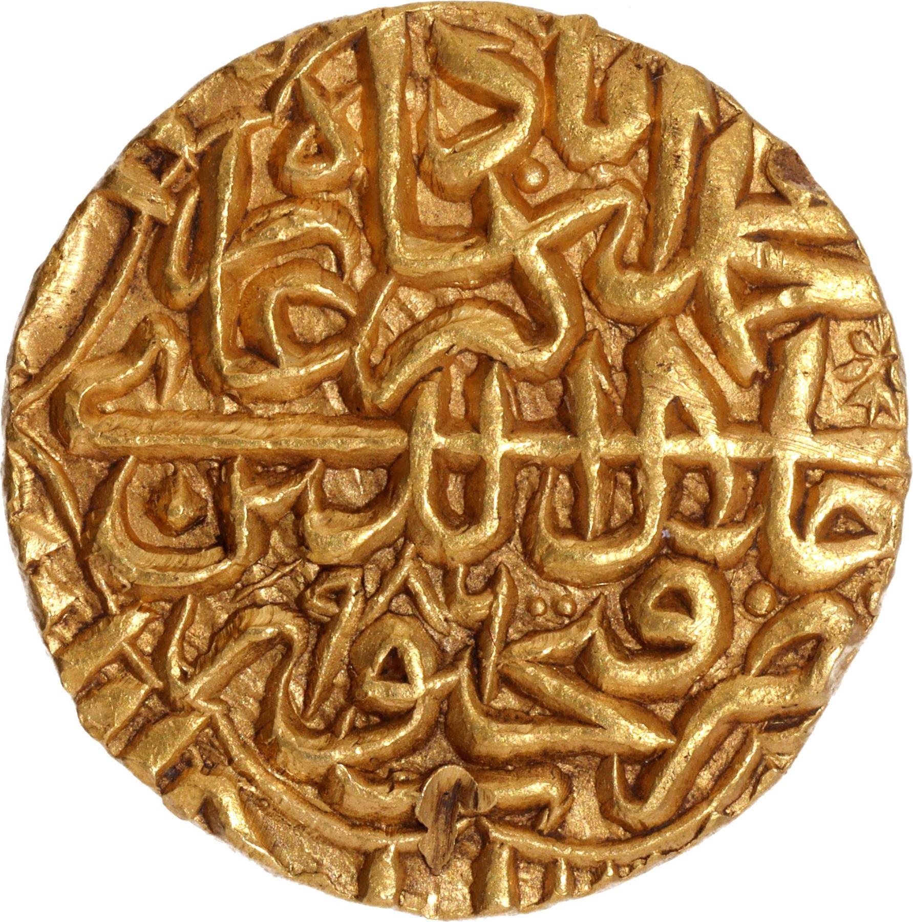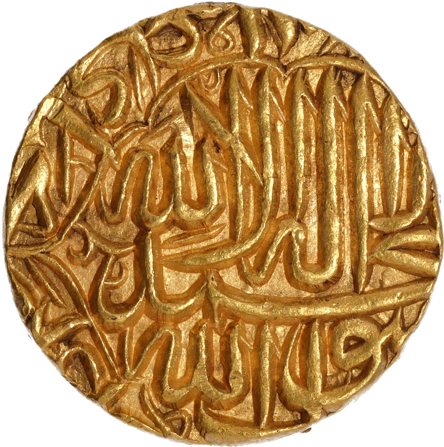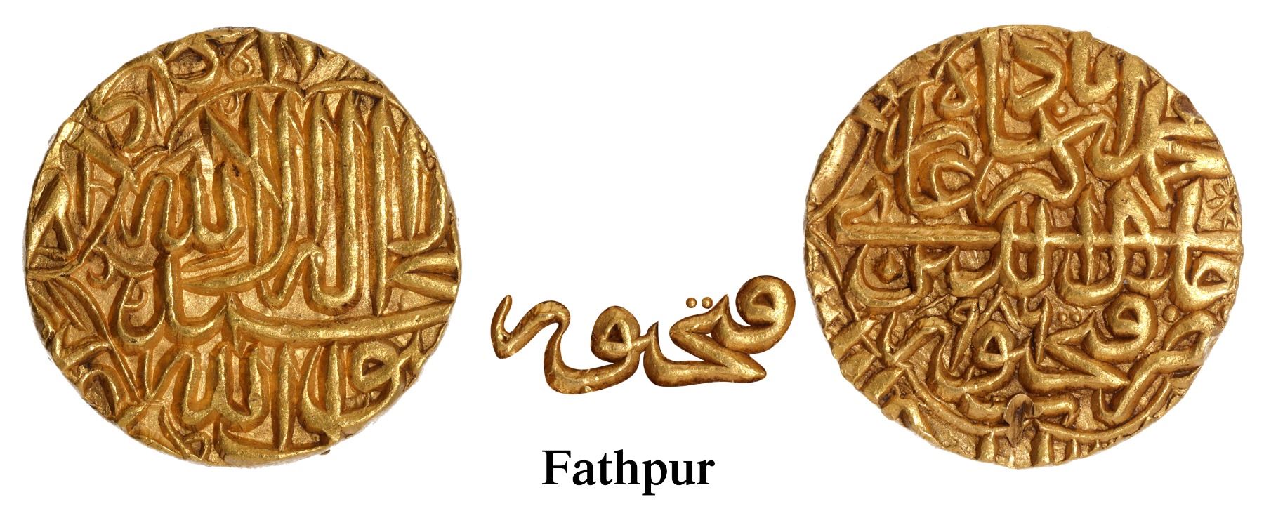 Note: In AH 976, Akbar founded Fathepur Sikri and moved his capital here from Agra. This place served as Akbar's capital from 1571 to 1585. This was also the adobe where the famous Saint Sheikh Salim Chishti lived, who was greatly revered by Akbar and after whom Jahangir was named. From AH 985 to AH 989, the mint operated for a brief period, and coins in all metals were produced. Coins made of gold, both square and round, are relatively rare. It is a one-year type that was only issued in AH 986 (1577 AD).