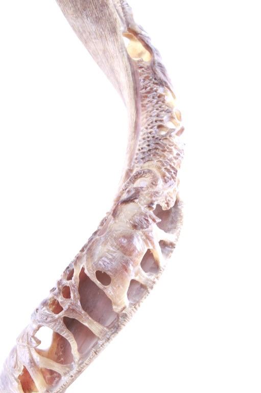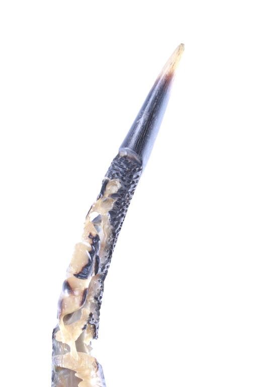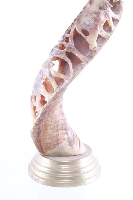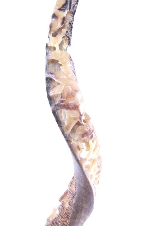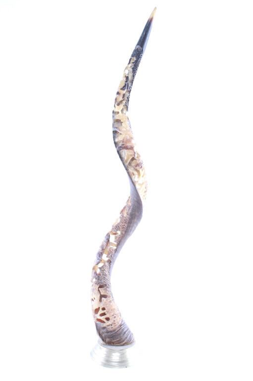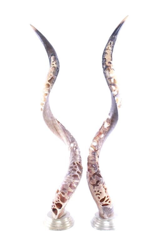 For your consideration this lot includes Two (2) Very Rare Hand-Carved African Kudu Horns. Each horn has a herd of elephants and savanna trees carved onto the horns with the elephants graduating in size down from the tips to the base. Each horn is mounted onto 5.25" diameter brass overlay metal bases. Kudus – the largest species of antelope – are woodland antelopes that are found throughout eastern and southern Africa. The horns of a male Kudu have 2.5 twists and – when straightened – the average length is 47” ; the record length is 74”. These horns are approximately 34"L each from base to tip, and make a stunning addition to an East or South African wildlife collection. Amazing craftsmanship. Each horn is in very fine condition, exhibits rich patina and awesome detailing, no obvious marring noted. Measurements average 6"W x 34"H