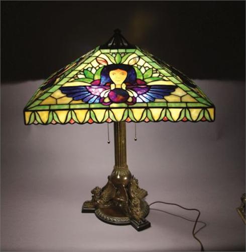 Very Early Handel Lamp with Phoenix Design Shade. Leaded and Painted glass, shown on the cover of the Handel Book. This is without a doubt one of the most beautiful lamps you will ever lay your eyes on. A real rare opportunity to own this gorgeous piece of art. Shade 20 inches square, Lamp is 25 inches tall.
