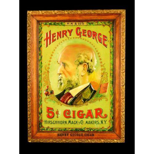 Very Rare, Henry George 5 cent Cigars Embossed Tin Sign, in original frame. This is a very colorful image of Henry George. Henry was an American Political Economist in the late 1800s and a Proponent of the Single Tax. A few minor specks otherwise excellent original condition. 17 X 23 inches overall.