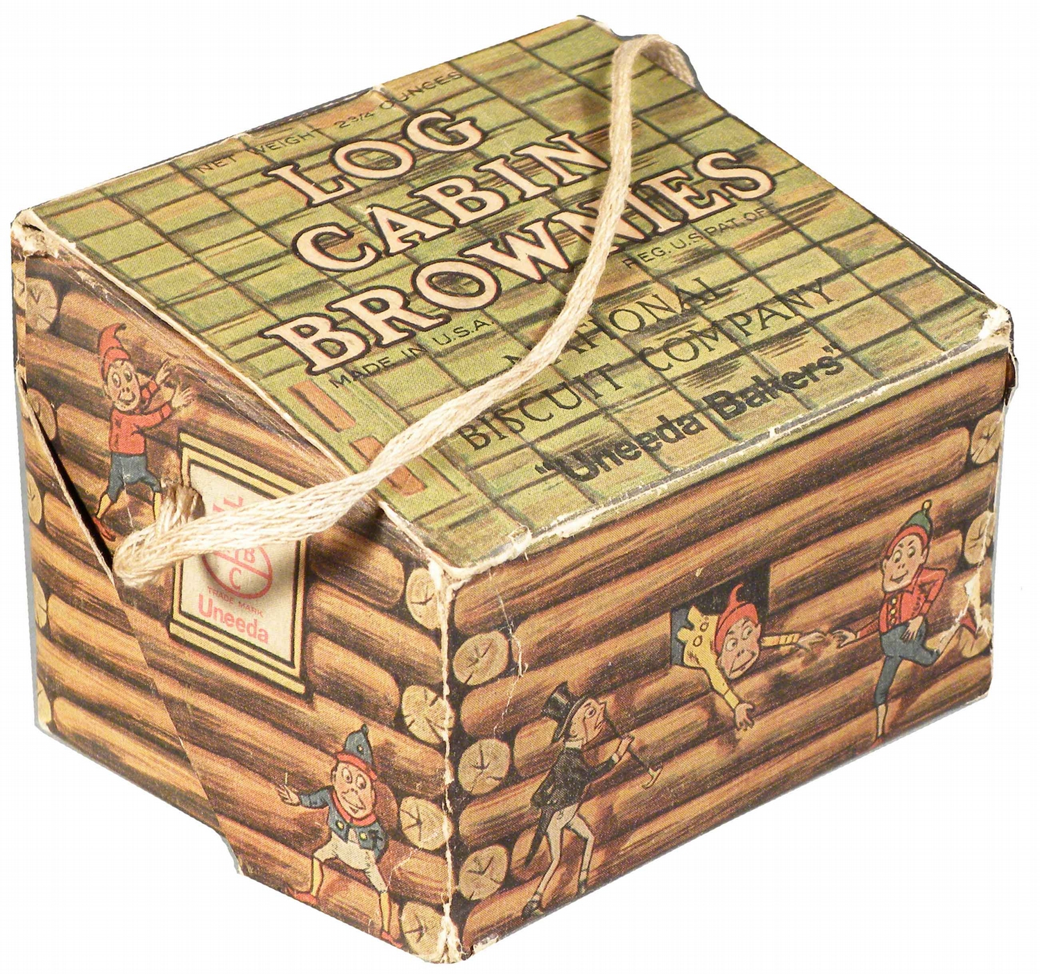 Log Cabin Brownies Box. National Biscuit Company. "Brownie" motif. Minor tear on front right corner otherwise very good condition. 3 1/2 X 3 X 3 inches.