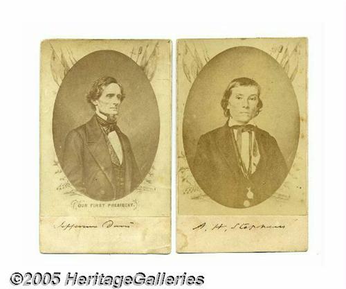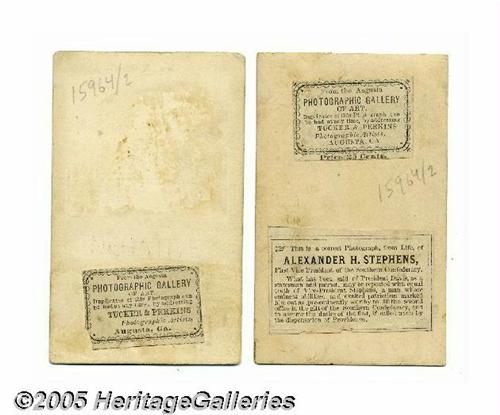 <B>Very Rare Matched Pair of Jefferson Davis and Alexander Stephens Cartes de Visite</B></I> Albumen photos include flags and background decoration, with facsimile signatures printed on the mounts below. Very rare Southern-issue, by the Georgia studio of Tucker and Perkins, Augusta. Great condition on these outstanding Civil War era cartes. Each 2.25" x 3.75". Lot:258