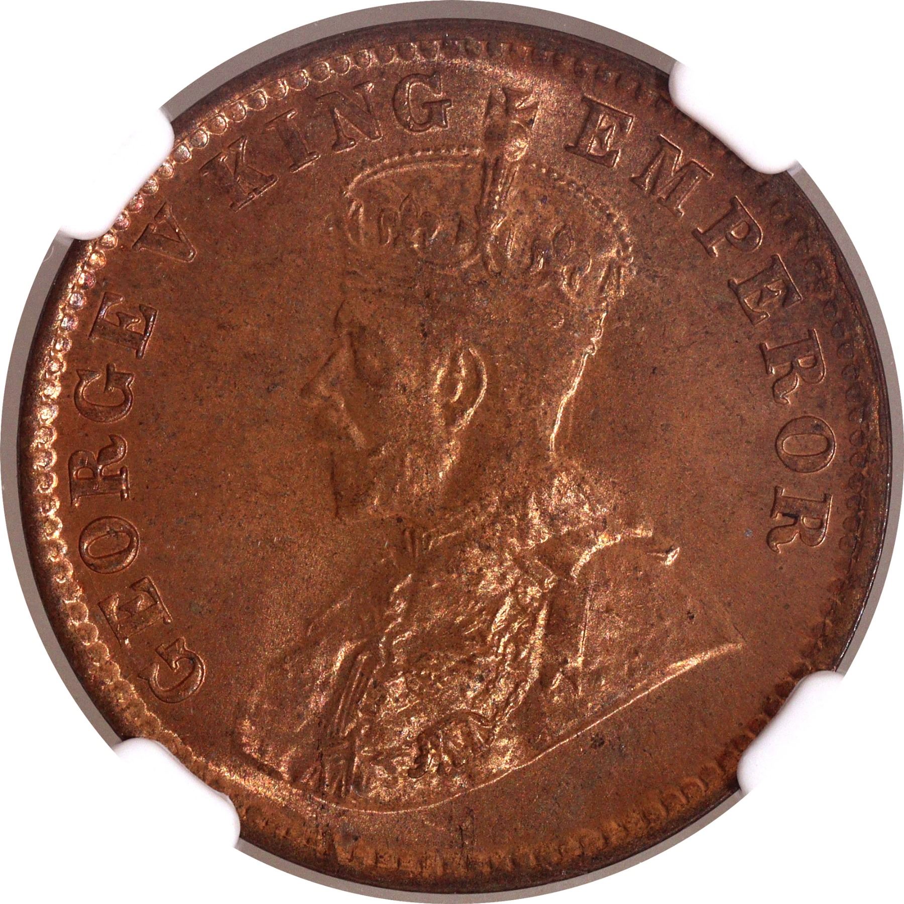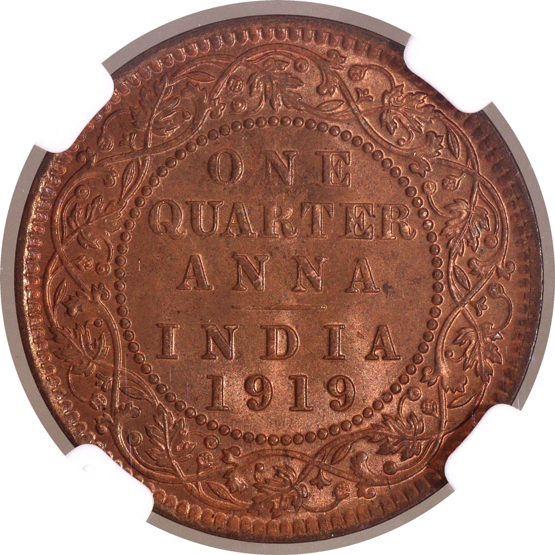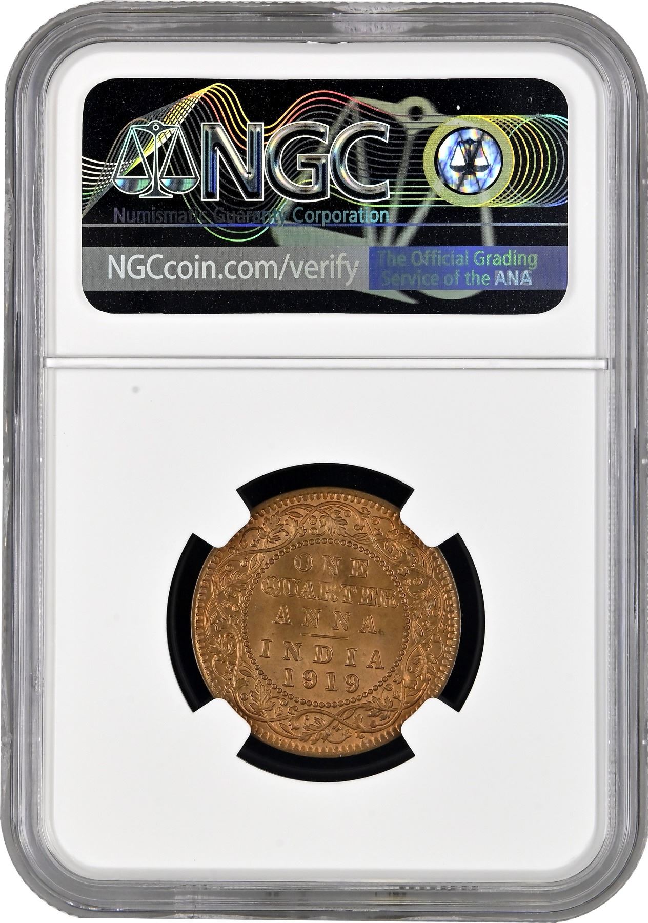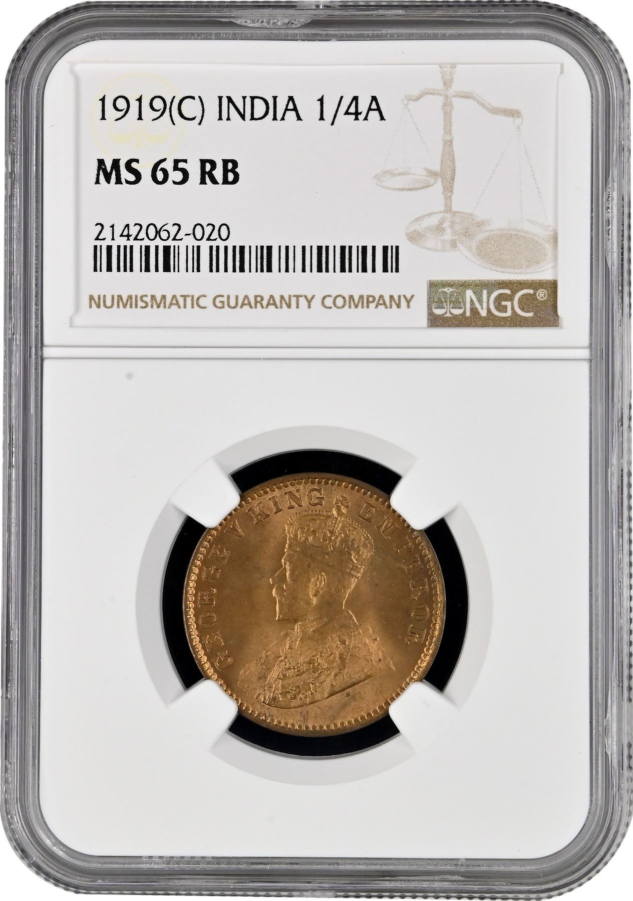 1919, King George V, Bronze ¼ Anna, Calcutta Mint, no dot, (PR # 664/GK # 1178), ghost image visible, original luster & toning, graded & slabbed by NGC as MS 65 RB, Very Rare in this grade.