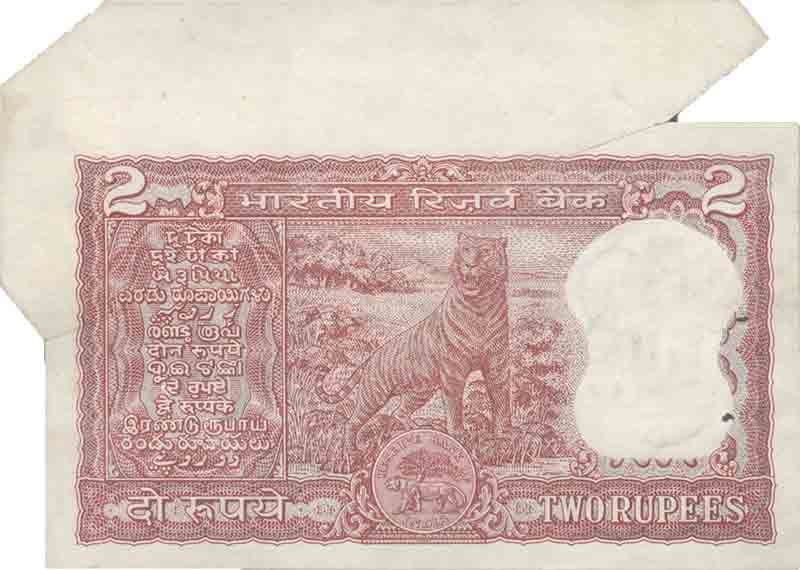 2 Rupees,Republic India, I.G. Patel Signature, B Inset, S.No. 64C 600784,Error: Extra 35% non-printed paper on the righttop,about extremely fine,Very Rare.