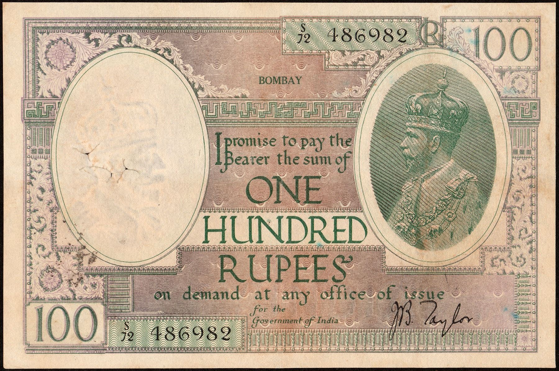 British India, 1928, King George V, 100 Rupees, Bombay Circle, Signed by J.B. Taylor, S Prefix, S. No. S72 486982, Watermark type 2, printed in Nasik, (KJ & RR # 3.10.2A), spindle and pin holes, stains, internal tears, ink stamp at the back, crisp paper quality, overall attractive, about very fine, Very Rare.