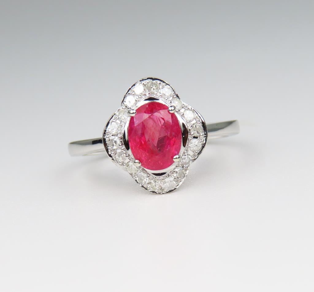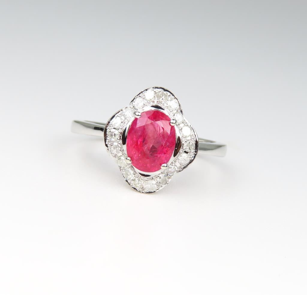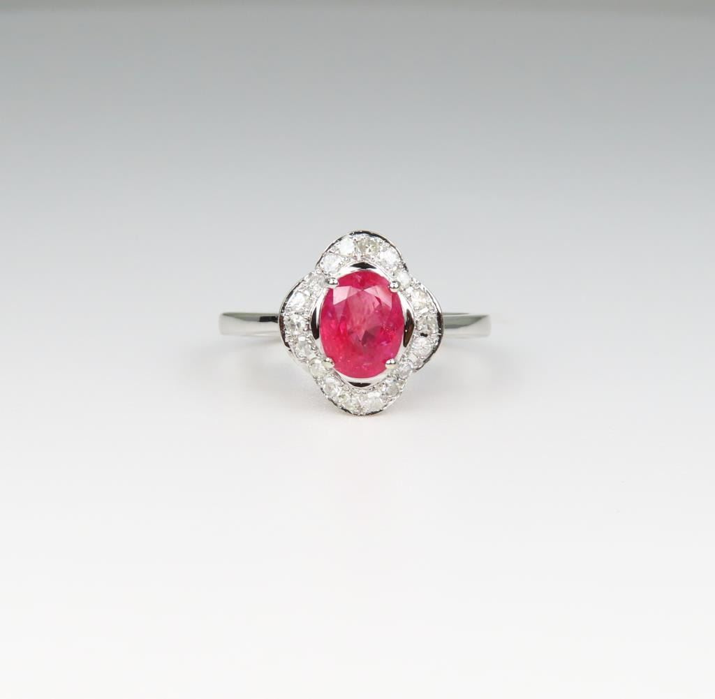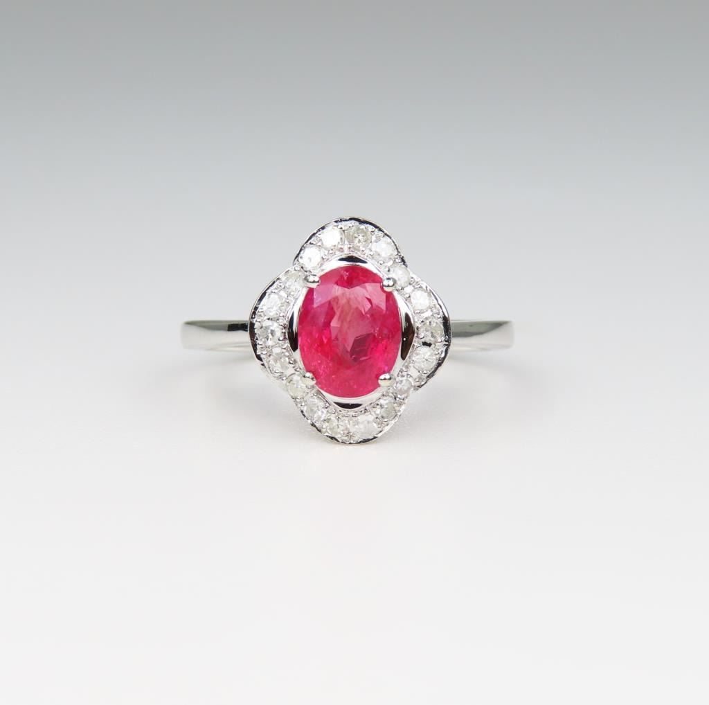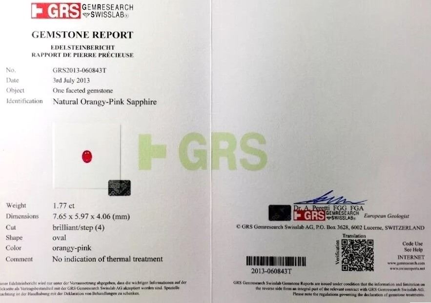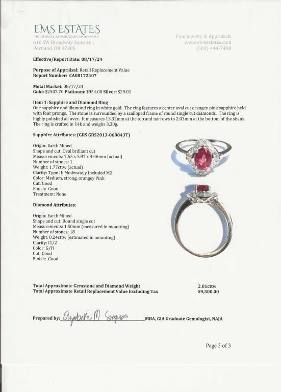 Sapphire and Diamond Ring featuring a G.R.S. Swiss Lab NO Heat, NO Treatment Natural Orange-Pink Sapphire weighing 1.77 carats. Sapphire is framed with 20 round cut Diamonds weighing approx. 0.24 carats with G-H colors set in a scalloped design setting crafted in 14 karat white gold, Size 7 ½. Full Appraised Retail Value - $9,500.00
