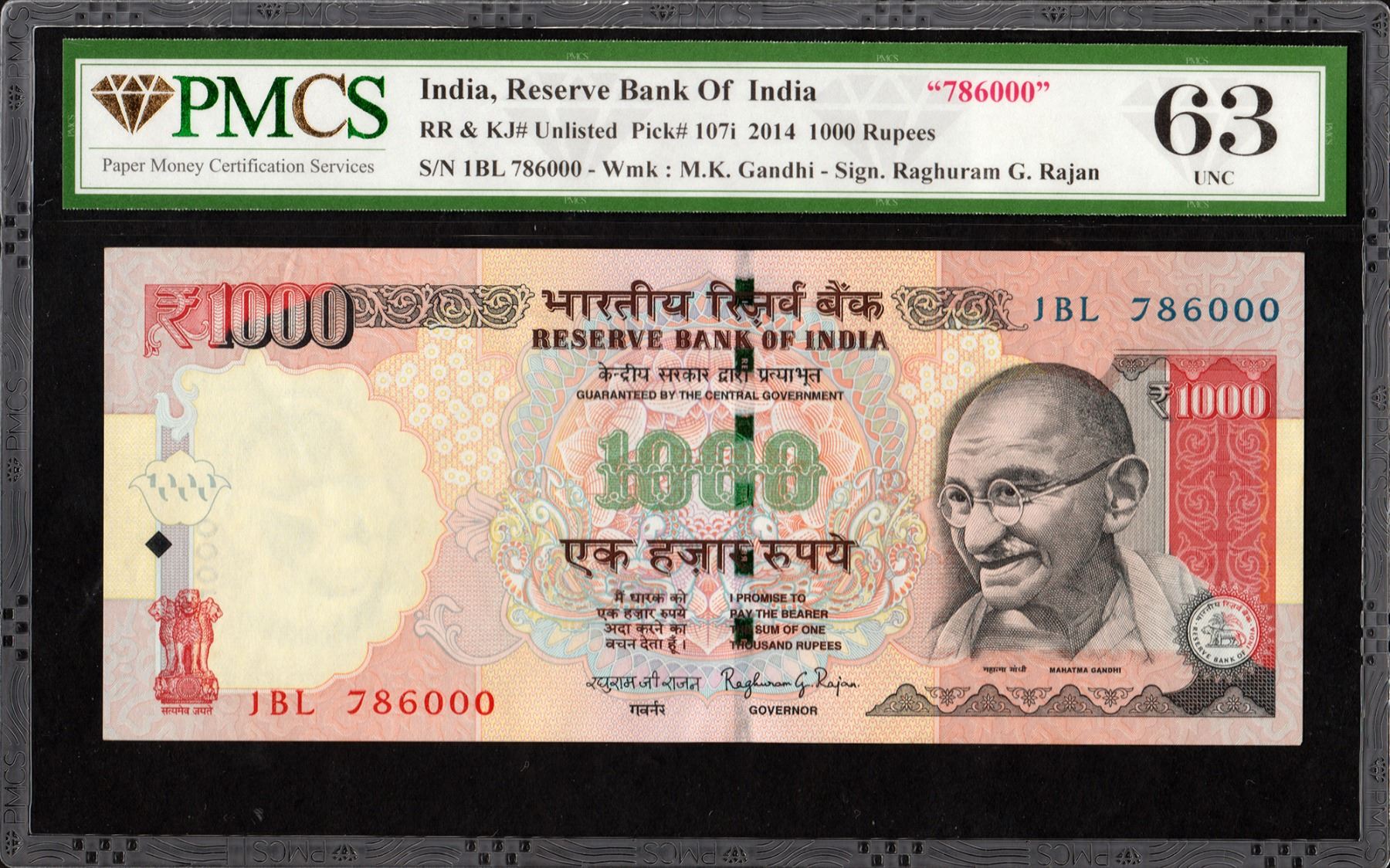 Republic India, 2014, 1000 Rupees, 786000, Fancy Number, Signed by Raghuram G. Rajan, Plain Inset, BL Prefix, S. No. 1BL 786000, graded by PMCS as 63 UNC, Very Rare.