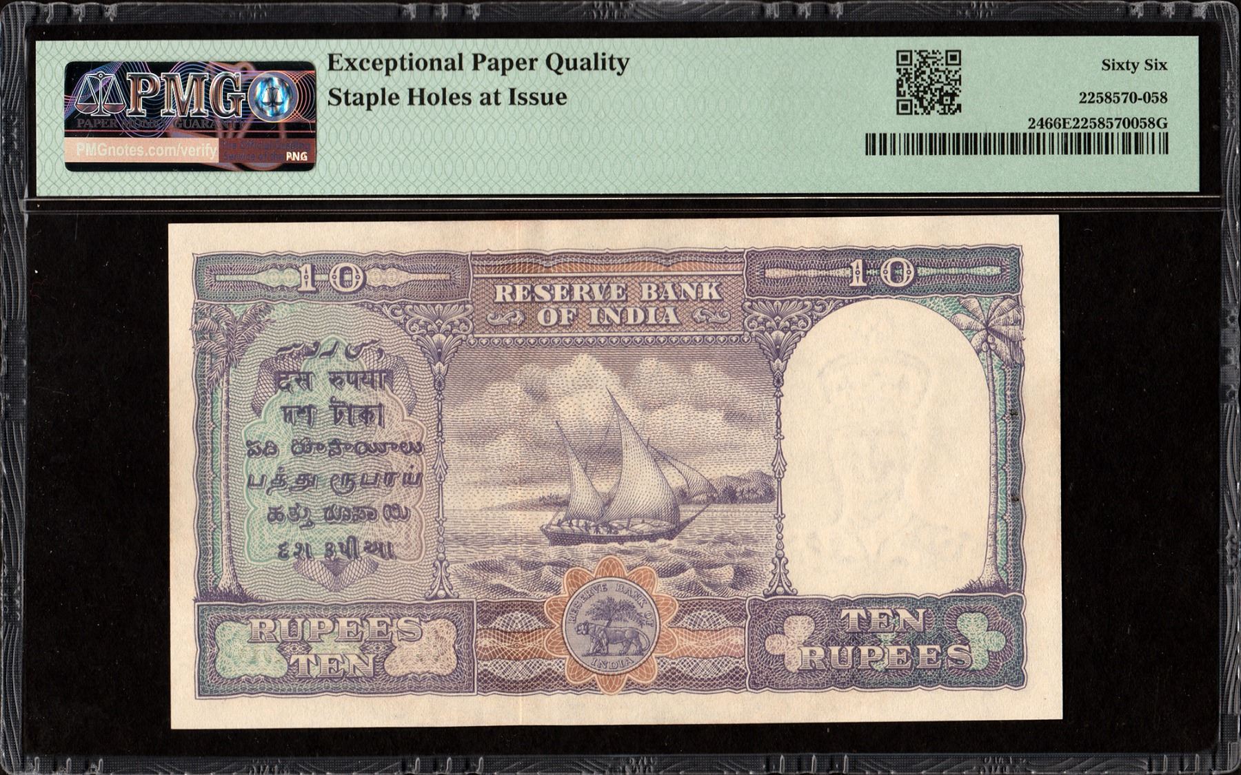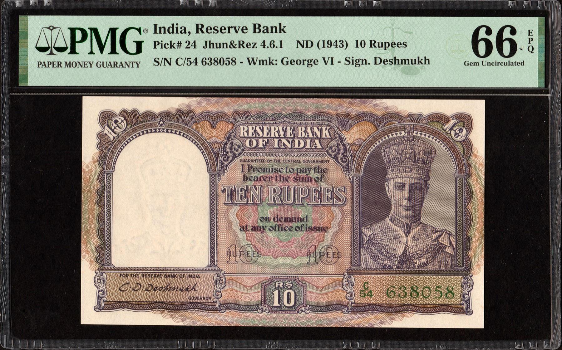 British India, 1944, King George VI, 10 Rupees, Signed by C.D. Deshmukh, Serial number in Green, C Prefix, S. No. C54 638058, (KJ & RR # 4.6.1), staple holes at issue, exceptional paper quality, graded by PMG as 66 Gem Uncirculated EPQ, Very Rare in this grade.