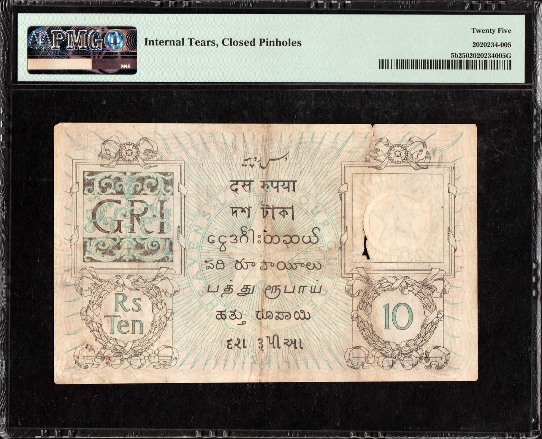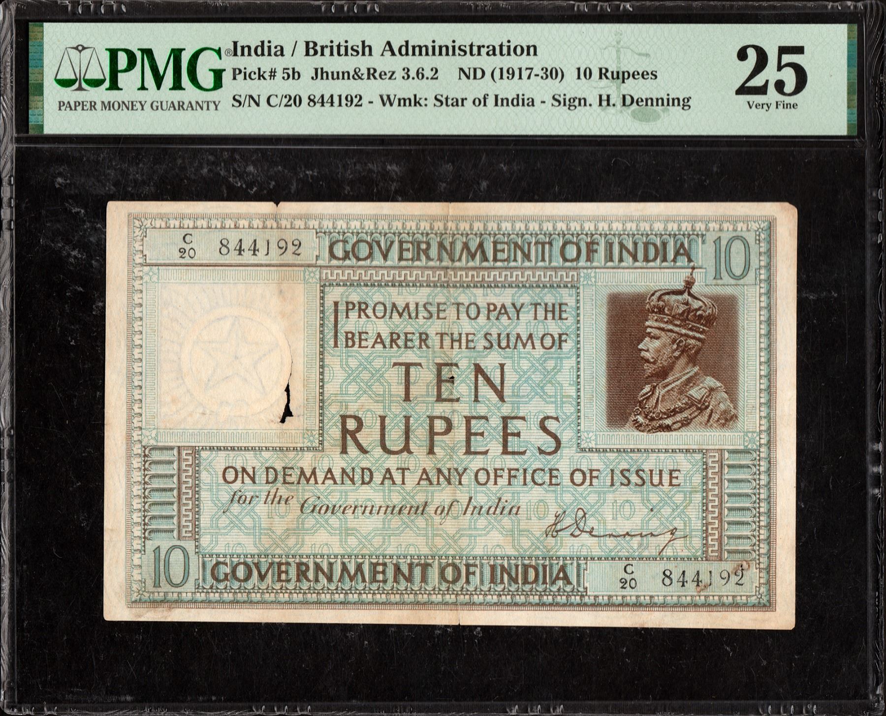 British India, 1923, King George V, 10 Rupees, Signed by H. Denning, C Prefix, S. No. C20 844192, (KJ & RR # 3.6.2), closed pinholes, stains, folds, internal tears, graded by PMG as 25 Very Fine, Very Rare.