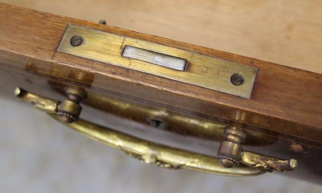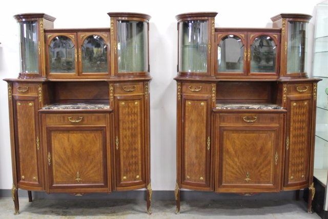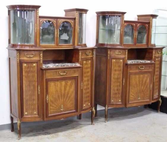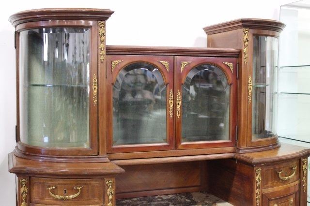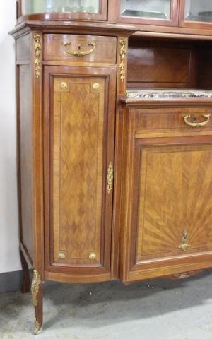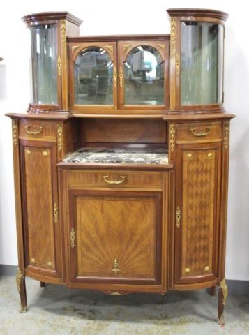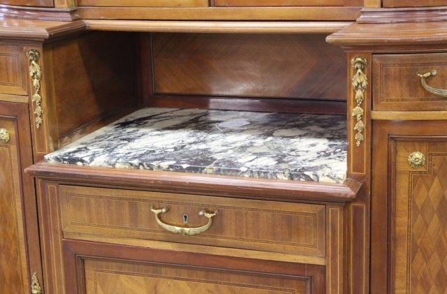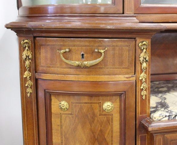 Bronze mounts. Radial and checkerboard inlays. Central marble insert. 4 beveled glass doors on top. 3 drawers and 2 doors. Approx. 74" H x 53" W x 19" D.