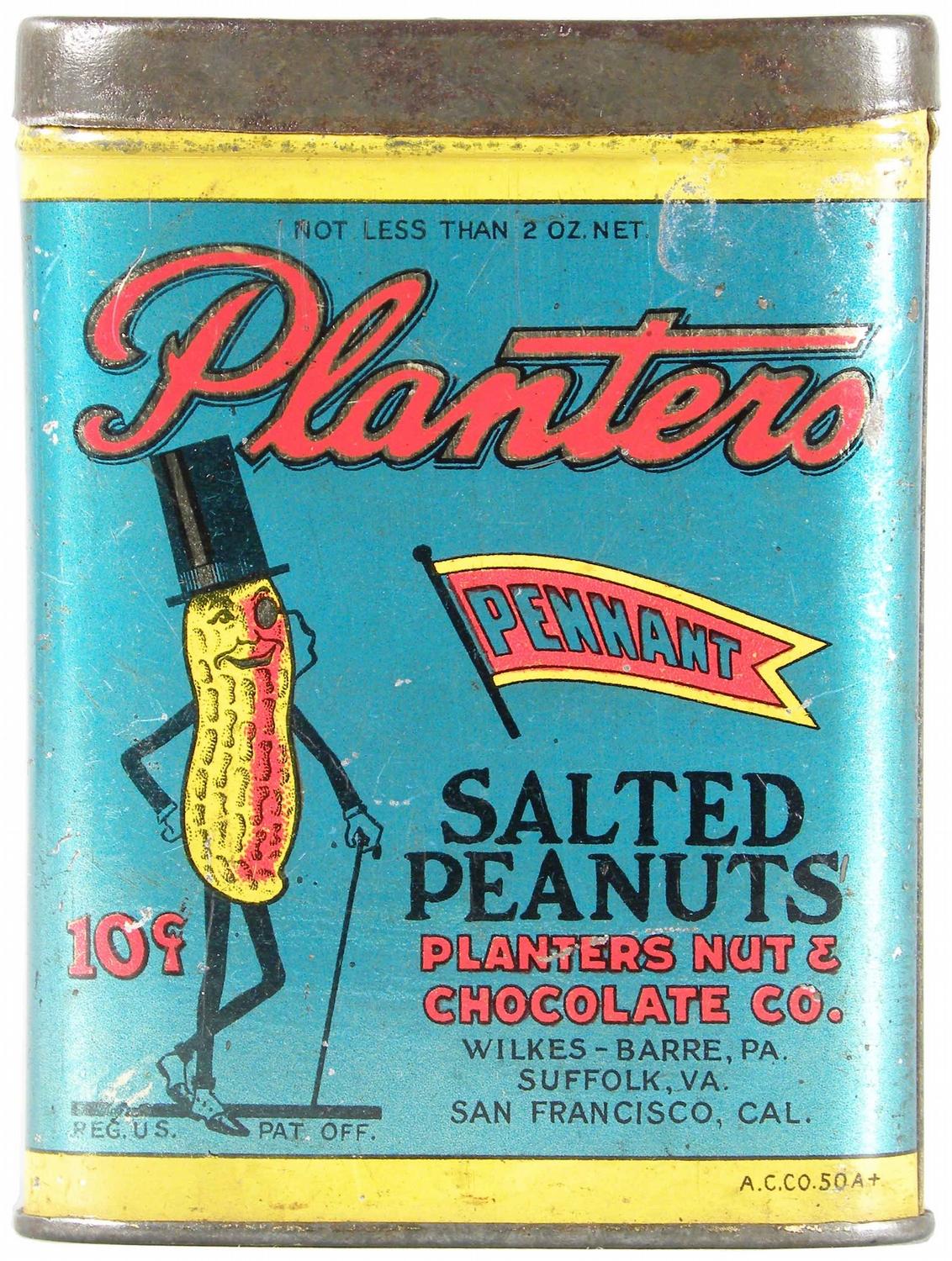 Very Rare Planters Peanuts Pocket Tin, 10 cents. Planters Nut & Chocolate Co. Wilkes-Barre, PA. Suffolk, VA. And San Francisco, Cal. 2 3/4 X 3 1/2 X 1 inch. Lid may not be original and a few minor scratches otherwise very good condition.