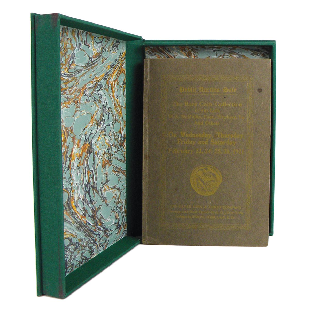 Elder, Thomas L. PUBLIC AUCTION SALE OF THE RARE COIN COLLECTIONS OF THE LATE M.K. MCMULLIN, ESQR. OF PITTSBURGH (SOLD BY ORDER OF MRS. MCMULLIN), H.C. WHIPPLE, ESQR., AND OTHERS. RARE UNITED STATES GOLD COINS, NUMBERING ABOUT 300 PIECES, WITH FIVE $50 GOLD PIECES; PRIVATE GOLD... SPLENDID U.S. CENT COLLECTION, WITH ALL DATES INCLUDED; FINE HALF CENTS... THE RAREST AND OLDEST NUMISMATIC BOOKS, ETC., ETC., ABOUT 2800 LOTS. New York, Feb. 23-26, 1921. Small 8vo, original gilt-printed card covers. 150, (2) pages; 2856 lots; 16 very fine photographic plates. Housed in custom-made clamshell box. Marginal chip to one leaf; very near fine. Depicted on the superb plates are a number of rare large cents, colonials, pioneer gold slugs and other rare pioneer and regular issue United States gold coins. Also illustrated are ancient Greek and Roman coins, Japanese obans, important European silver coins, etc. Very rare: this is the first plated copy we have offered since 1992. Ex Kolbe Sale 50, lot 422.