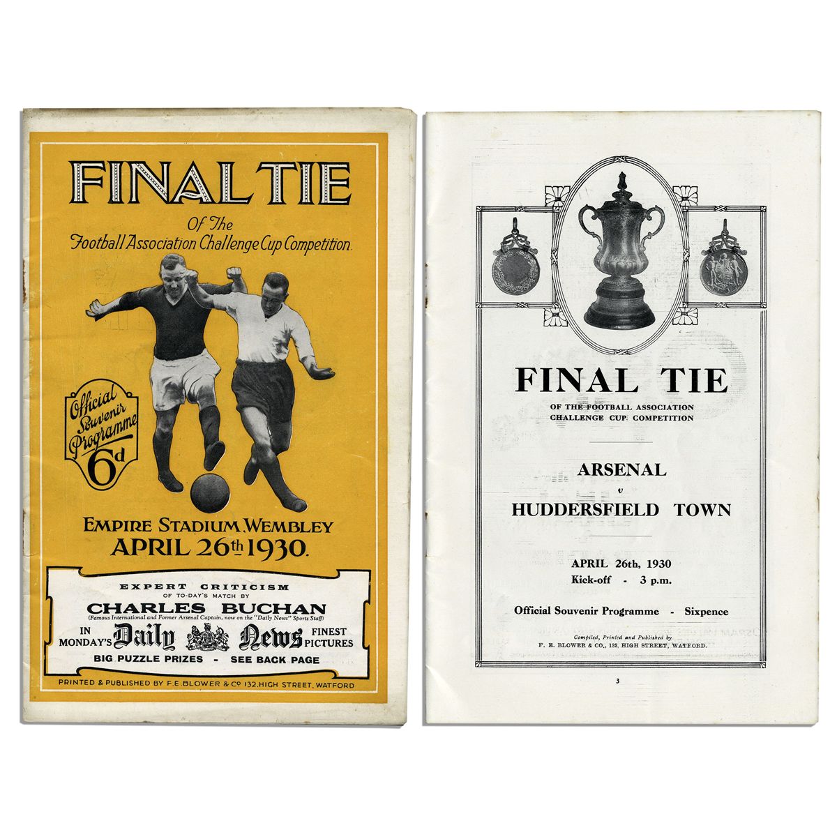 Highly desired program from the 8th Wembley Final. Program covers all aspects of the Arsenal and Huddersfield face-off in the 1930 soccer championship, which broke ground as the first in which the football teams walked out side by side, out of respect for Herbert Chapman, manager of the victorious Arsenal, who had managed Huddersfield in the years before. Program features a frontis photo of King George V and photos of the team within. Runs 26pp. and measures 6.25'' x 9.25''. Toning to top edge of front cover and rusting to staple binding. Near fine.