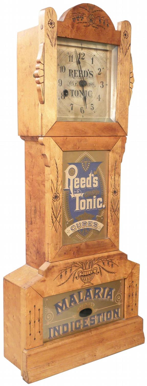 Reed's Gilt Edge Tonic Cures Clock. Beautiful Maple Cabinet. These clocks do not come up for sale very often. Light staining on the face otherwise excellent working condition. 10 X 24 X 4 1/2 inches.