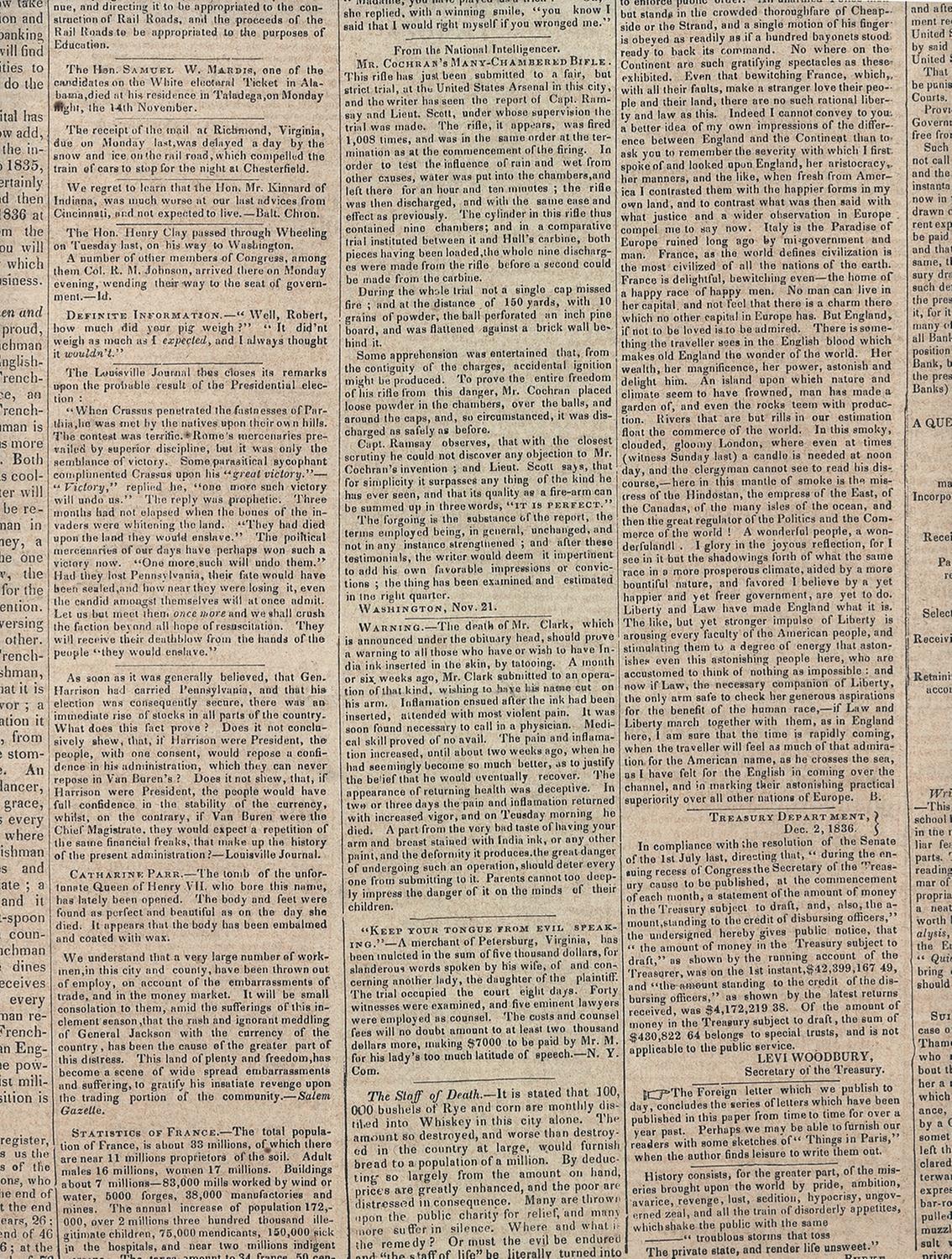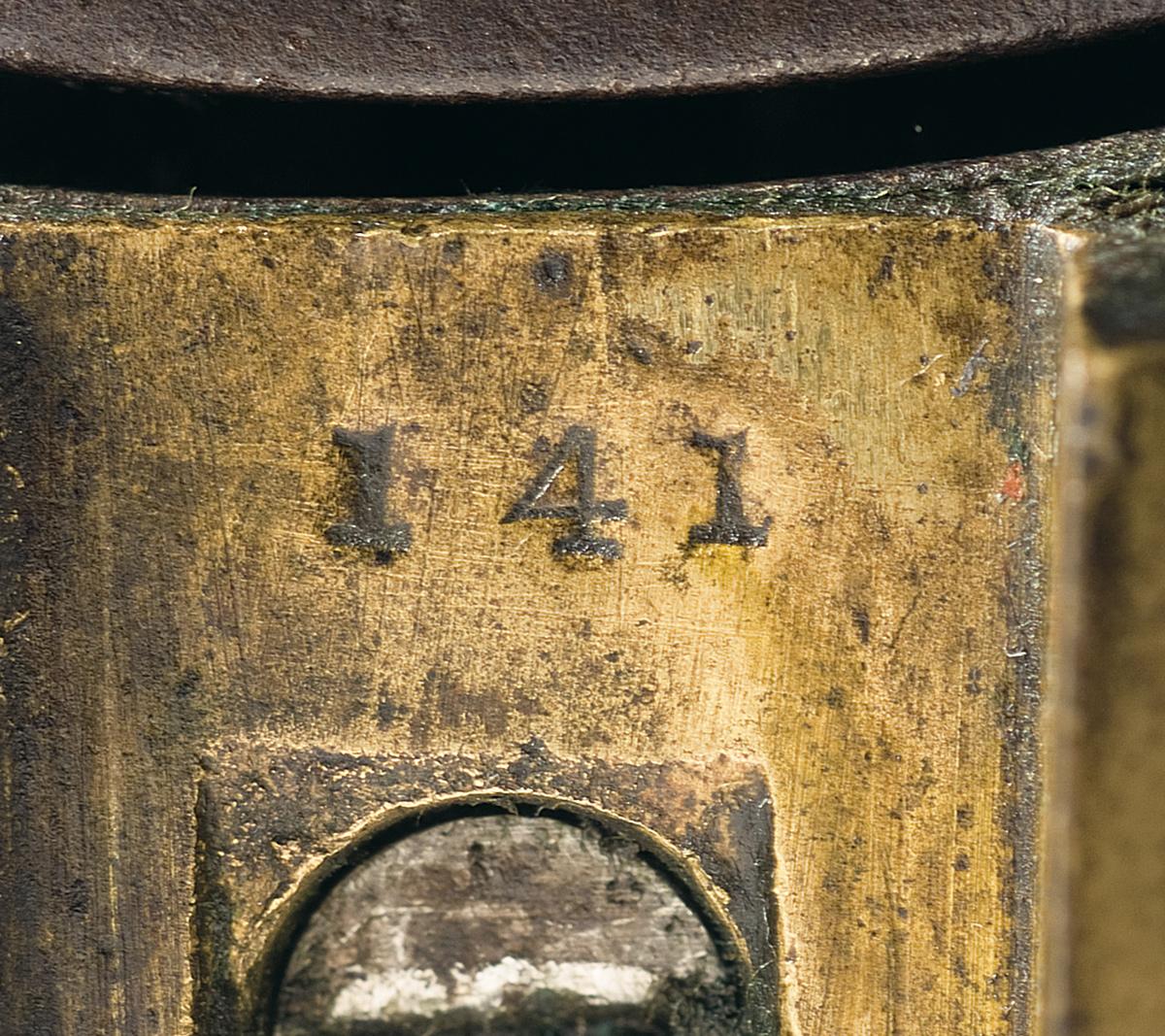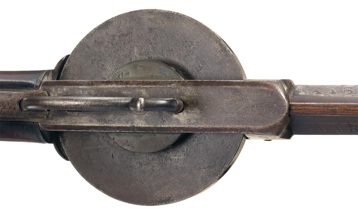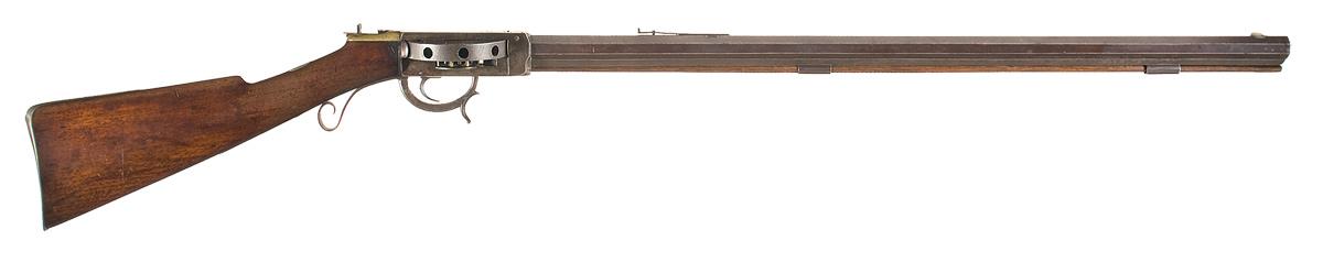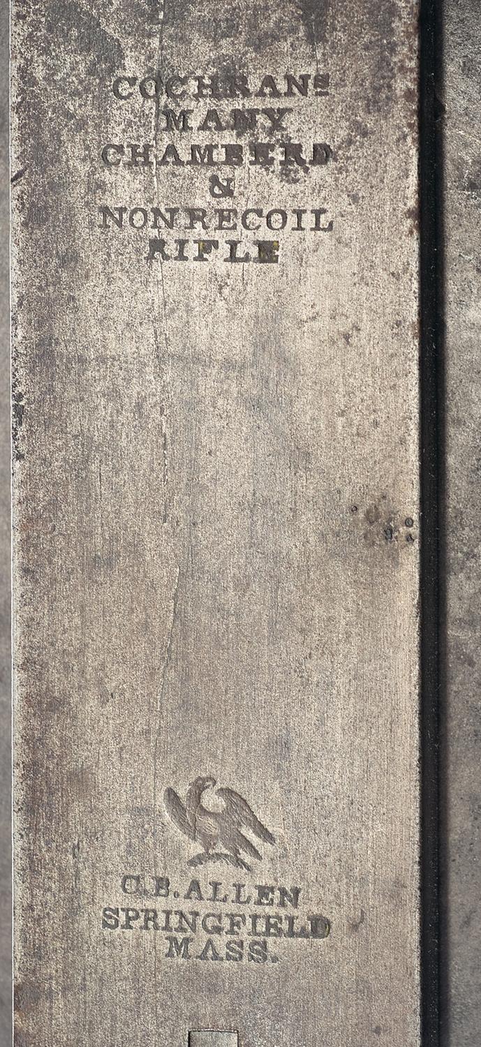 Produced in the late 1930s by C.B. Allen of Springfield, Massachusetts in the late 1830s. Blade front and elevator notch rear sights, with the lower flats of the barrel marked "AAB" and "141" on the left flat. The top strap is roll-stamped: "COCHRAN'S/MANY/CHAMBERED/&/NON-RECOIL/RIFLE" behind the top strap hinge and is stamped with an eagle over "C.B. ALLEN/SPRINGFIELD/MASS." at the rear of the top strap, and is hinged to swing up, allowing access to the nine chamber turret. Smooth straight grip stock, with a wood ramrod, silver inscription oval on the wrist, and a German Silver buttplate. With a copy of the Portland Advertiser (Portland, Maine) dated 9 December 1836, which includes an article on military trials performed on the rifle.