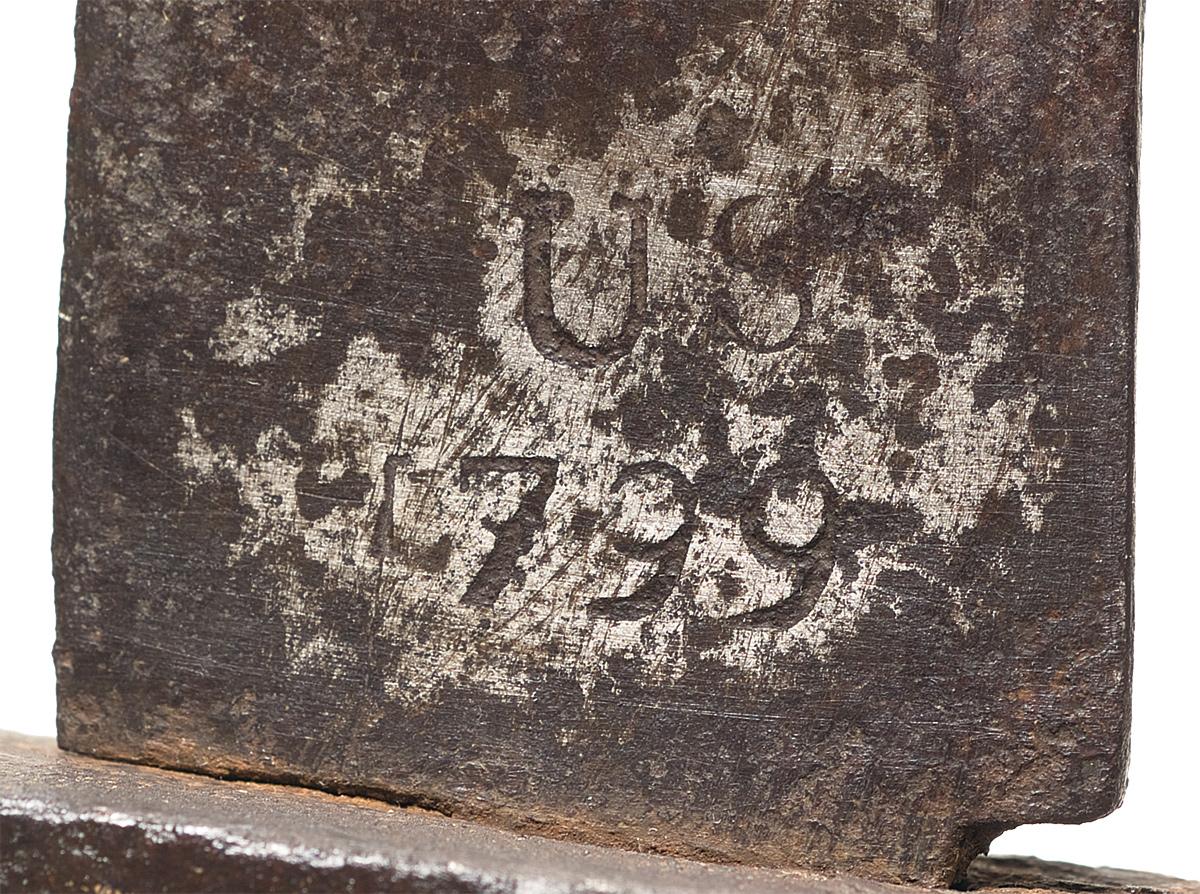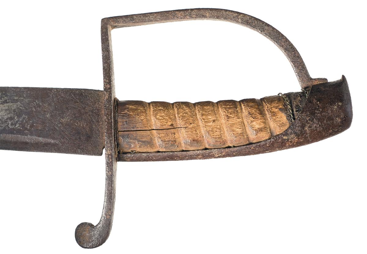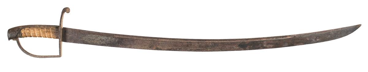Contract of 1798 Cavalry Saber manufactured by Nathan Starr & Co., of Middletown, Connecticut in 1798-1799. The 2000 cavalry sabers manufactured by Nathan Starr & Co. for the United States were the first edged weapons made under a U.S. government contract following the Revolutionary War. Surviving examples are extremely rare. The saber has a 34 1/2-inch curved single edge blade with 7-inch false edge and narrow fuller. The blade is 1 5/8-inch wide at the hilt. The blade is stamped "N. Starr & Co." on the obverse below the hilt. The markings run parallel to the back of the blade. The reverse is prominently stamped with "US" above the date "1799" in two lines perpendicular to the edge of the blade. The saber has an iron guard with stirrup shaped knuckle bow, down-turned quillion, and convex back strap which forms a flat pommel. The wooden grip has a leather cover and is wrapped with twisted brass wire. The saber does not have a scabbard.