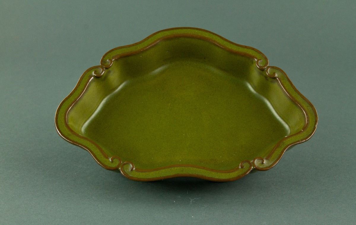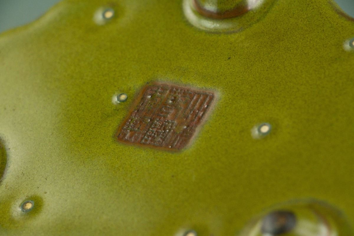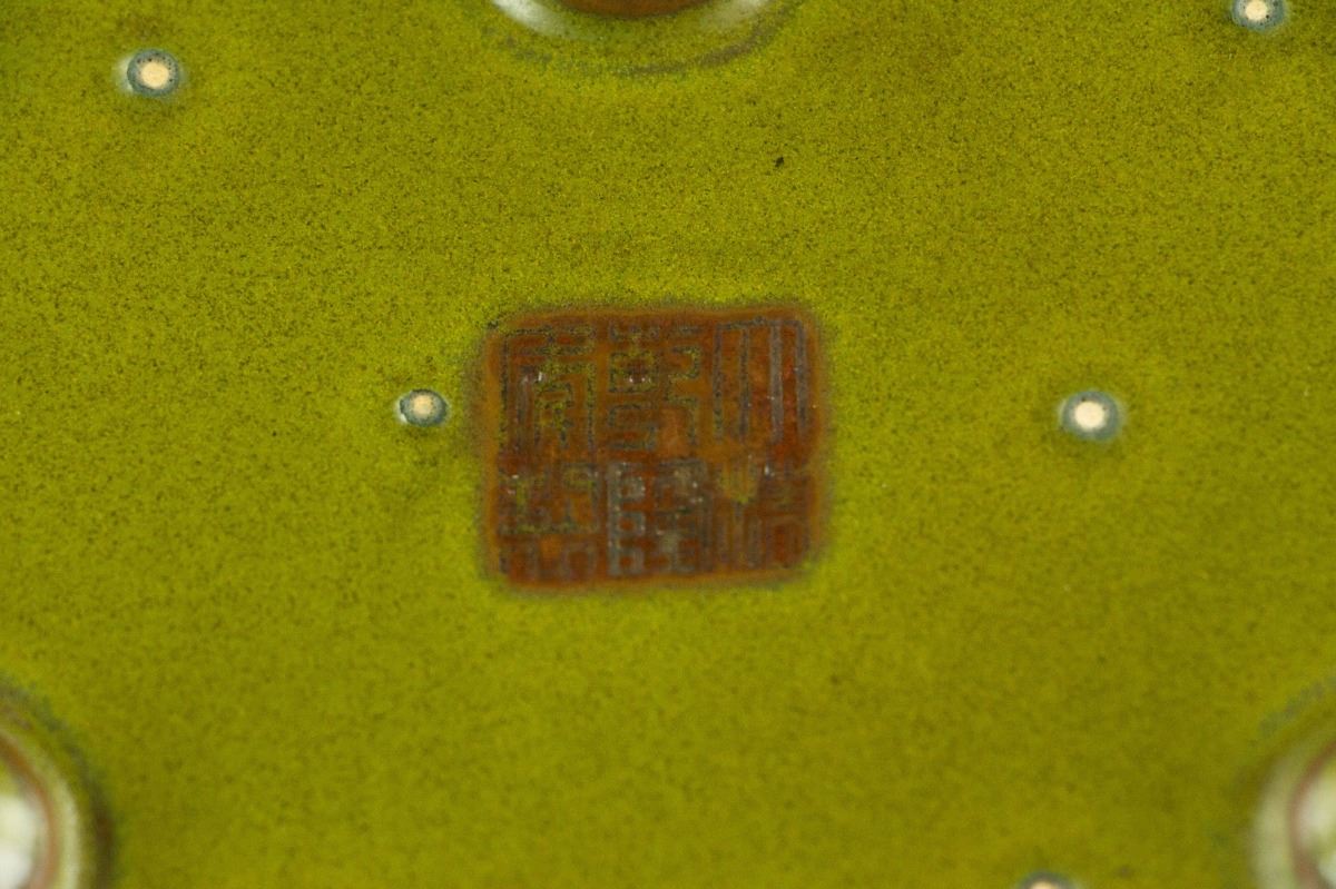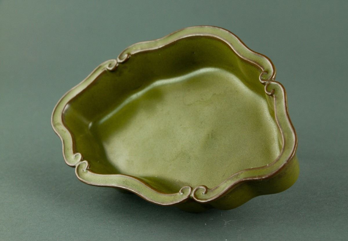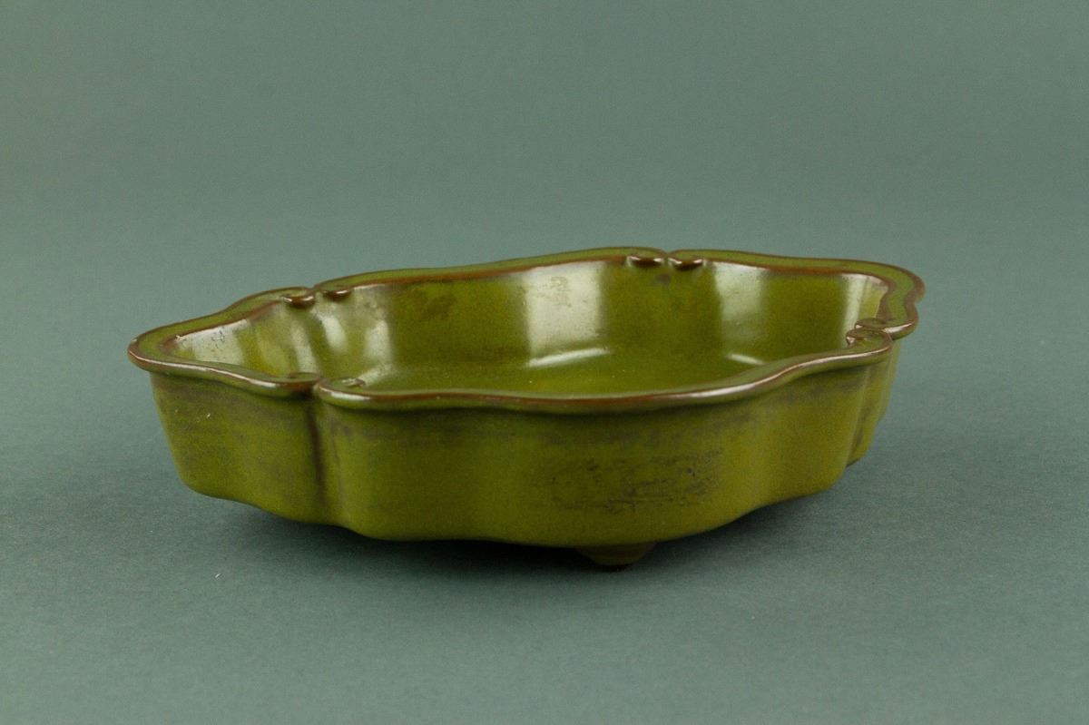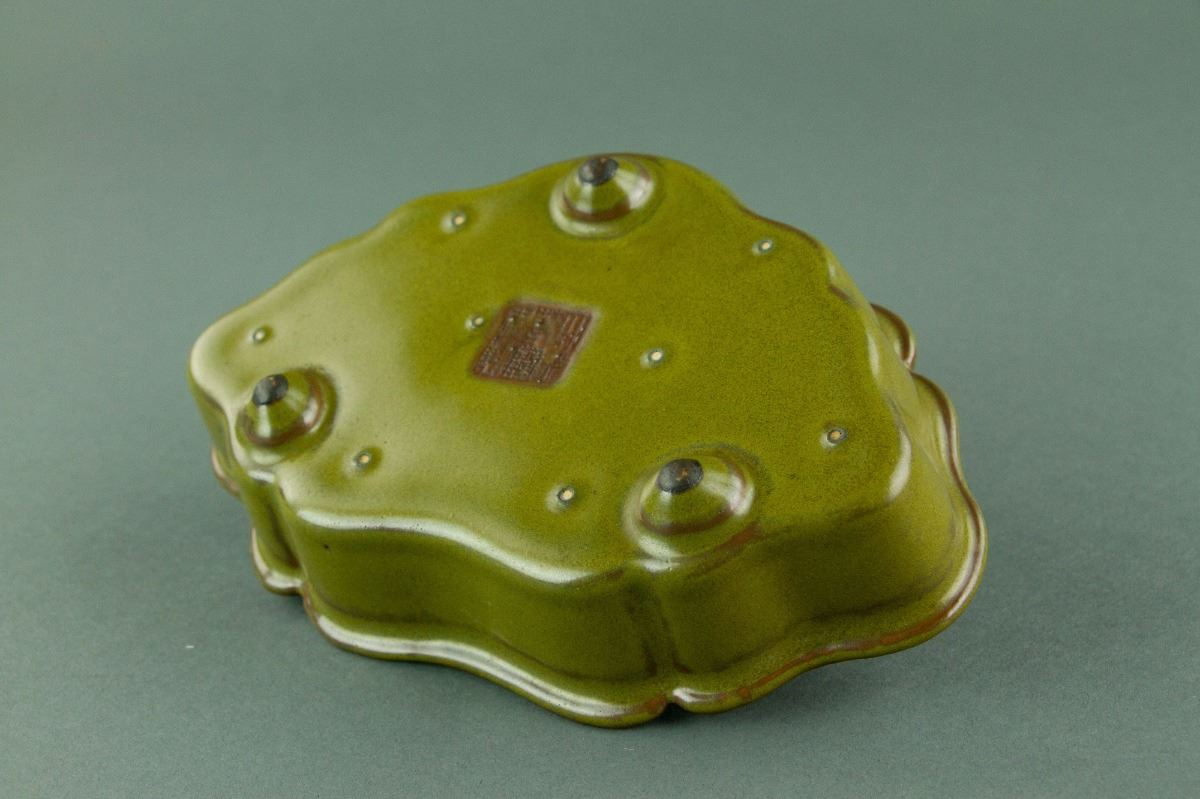 Chinese rare tea-dust glazed porcelain brush washer; of lobed sides supported on three bulbous feet; the mouth rim carved in form of ruyi heads; evenly covered with a lustrous olive-green glaze with yellow speckles; the base bears a brown-etched six-character Qianlong reign mark along with eight spur marks; H: 4.5 cm, W: 19 cm, 417 grams