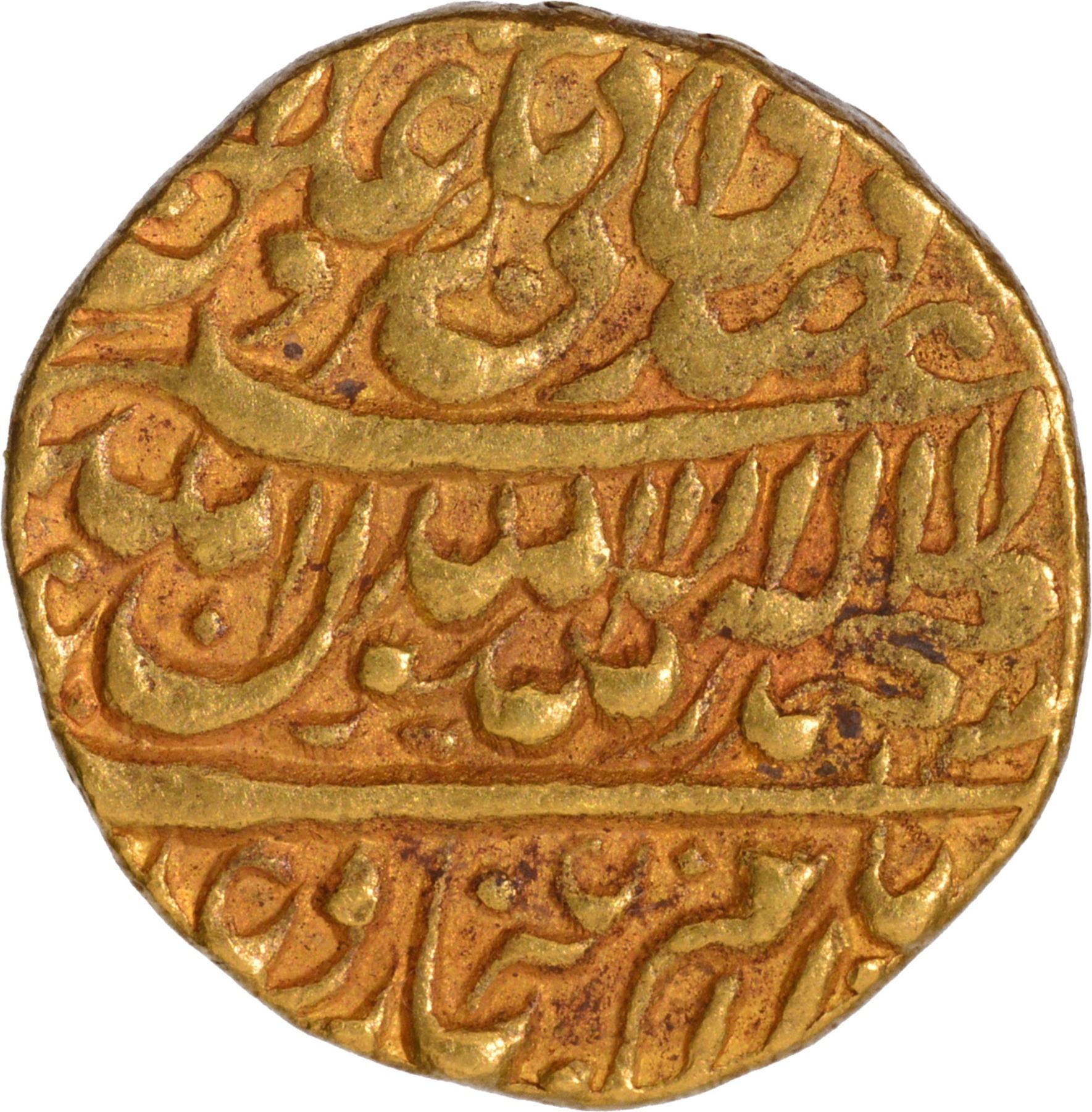 Shah Jahan (AH 1037-1068/1628-1658 AD), Akbarabad Mint, Gold Mohur, Obv: Persianlegend in three lines The Kalima Shahada in middle, on top two Caliphs names and two Caliphs at the bottom,Rev: Persian legend in four lines saheb-e-qiran Sani Shihab ud din Muhammad Shahjahan Badshah Ghazi and mint name at the bottom,10.61g, 20.15mm (Unlisted in KM), minor tiny test mark on the edge, choice quality, about extremely fine, Extremely Rare.