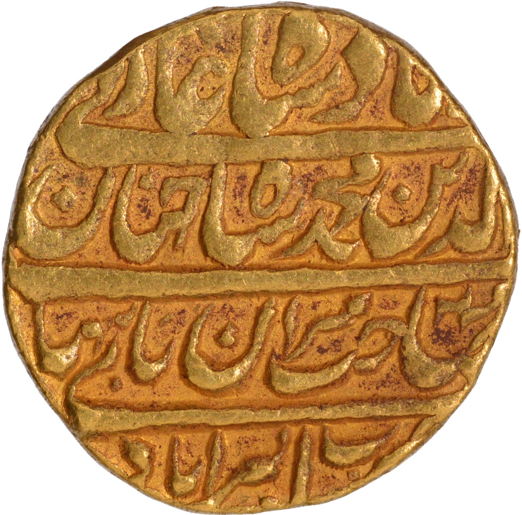 Shah Jahan (AH 1037-1068/1628-1658 AD), Akbarabad Mint, Gold Mohur, Obv: Persianlegend in three lines The Kalima Shahada in middle, on top two Caliphs names and two Caliphs at the bottom,Rev: Persian legend in four lines saheb-e-qiran Sani Shihab ud din Muhammad Shahjahan Badshah Ghazi and mint name at the bottom,10.61g, 20.15mm (Unlisted in KM), minor tiny test mark on the edge, choice quality, about extremely fine, Extremely Rare.