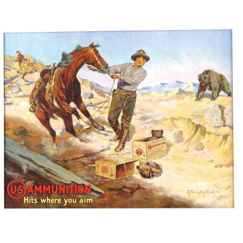 U.S. Ammunition Paper Sign. Depicting cowboy and horse fleeing a bear. R. Farrington Elwell artist. Framed under glass. Mint condition. 16 X 12 1/2 inches.