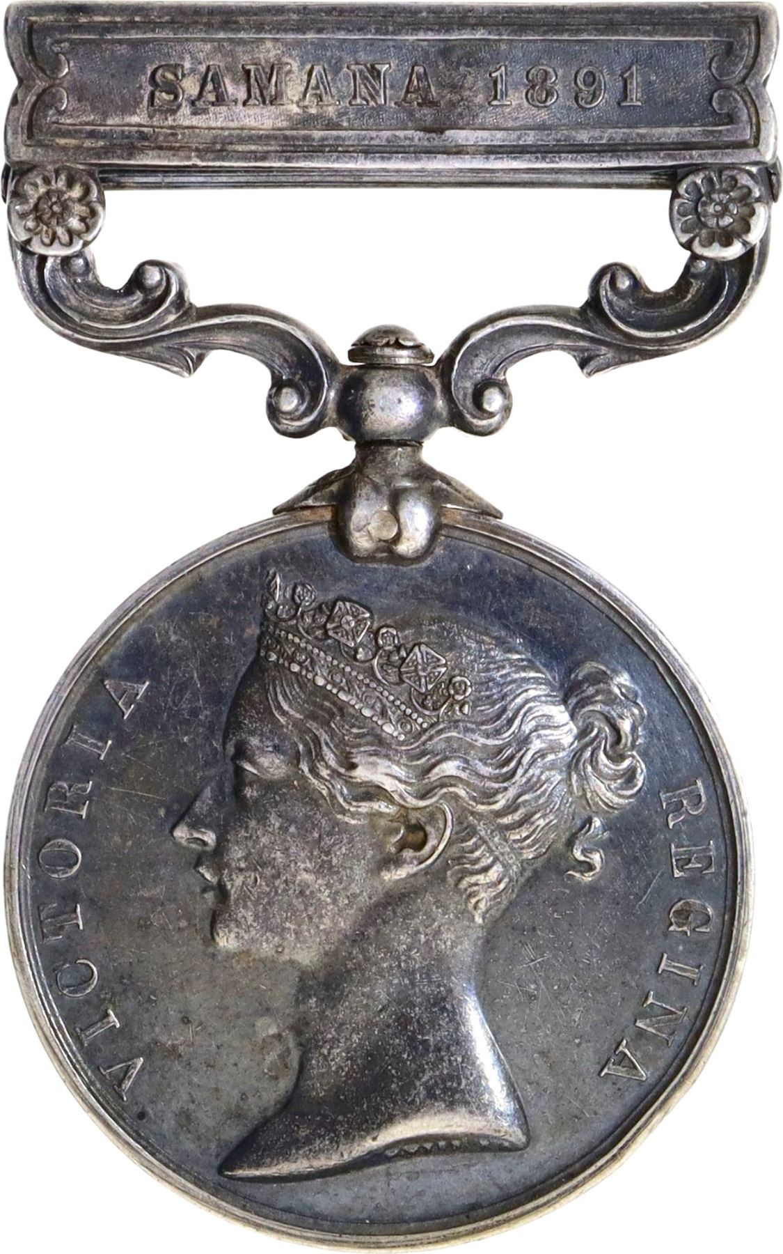 British India, India General Service Medal (1854-95), Victoria Queen, Silver, Awarded to "Sayad Ghulam", Clasp "Samana 1891", Obv: bust of Queen Victoria facing left, legend around "VICTORIA REGINA", Rev: Victory crowning a semi-nude seated warrior, bar with clasp "Samana 1891", engraved on the edge "Sayad Ghulam", 39.76g, 36.19mm, (MYB 2007 # 117), about extremely fine, Very Rare.