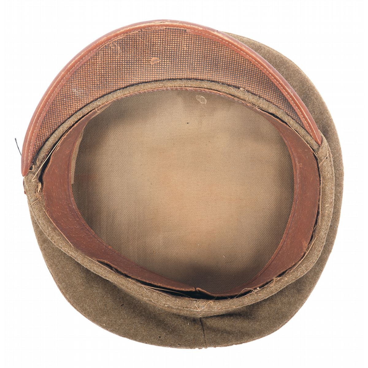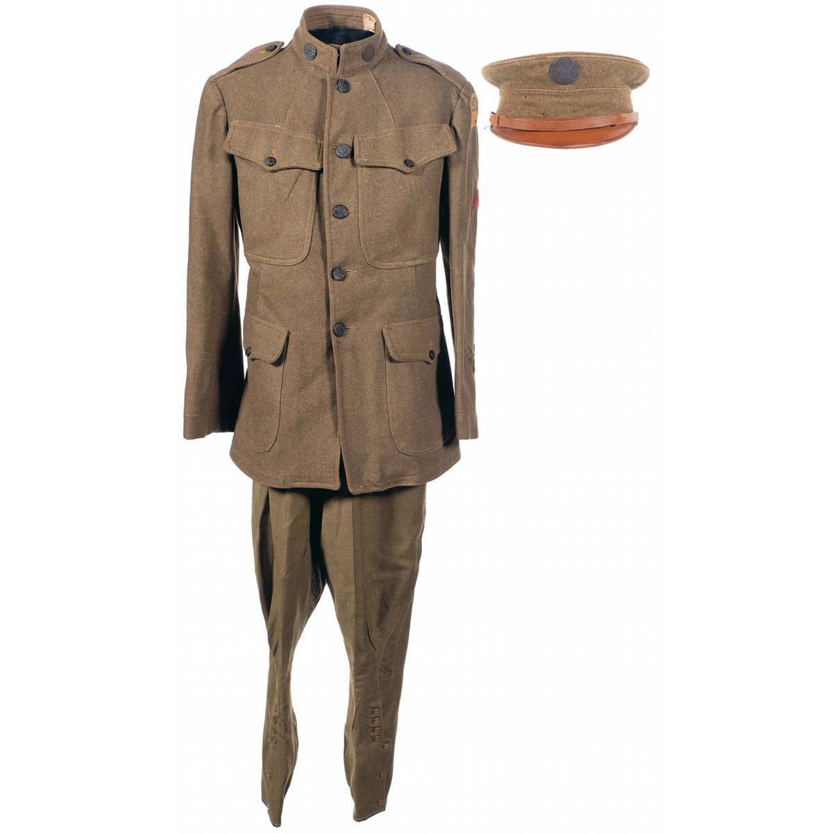 WWI Signal Corps Private's wool service uniform. The left shoulder has a rectangular yellow wool patch that is embroidered with the image of an observation balloon and basket. The collar has a round bronze "US" and Signal Corps insignia. A red private's stripe and two overseas service chevrons are sewn on the left sleeve. The blouse has a size 38 tag in the collar. The blouse is complete with wool trousers, visor service cap with Army insignia, and three sets of wool puttees. This is a very rare WWI uniform.