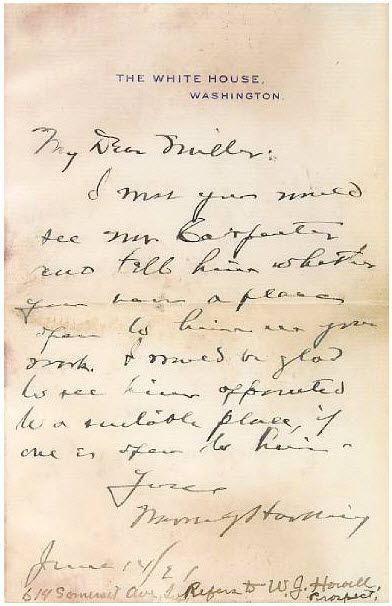 Warren Harding autograph letter signed as President, dated 14 June 1921. One page letter on official White House stationery recommends a Mr. Carpenter for a position and is signed, ''Warren G. Harding''. Some dampstaining at center crease, otherwise very good. Note at bottom in a different hand indicates that the letter ''refers to W.J. Howell, Prospect.'' Autograph letters dating from Harding's presidency are rare.