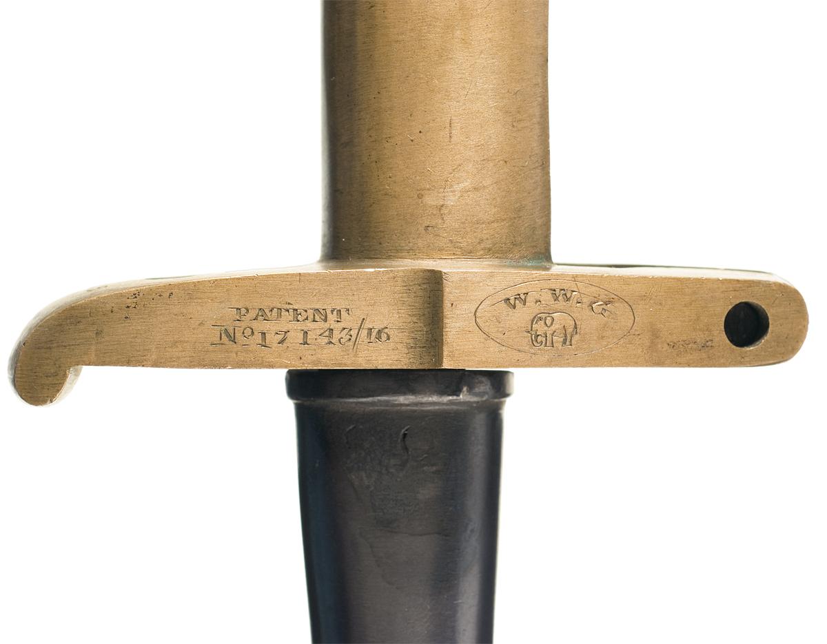 The brass cross guard is marked "PATENT / NO 17143/16" next to "W.W.G." above an elephant inside an oval and has the number "123". Has an 8 1/4 inch triangular blade. Complete with a blued iron scabbard.