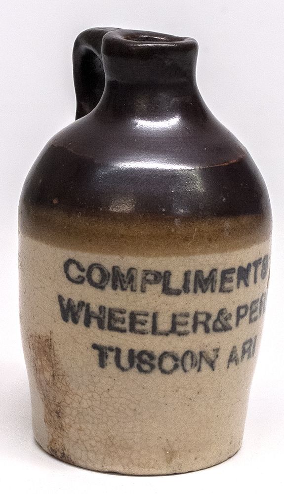 1902 This is a small sample crock from Tucson business Wheeler & Perry. According to Michael Miller’s A Collector’s Guide to Arizona Bottles & Stoneware, second edition, the partnership of Wheeler & Frye first operated as a fruit supply business in 1885 and after Frye left the following year, the new partner William I. Perry came on board and the business grew to include groceries and a bakery. It wasn’t until 1906, when the business moved to 44 E. Congress St. Again, this is a very rare miniature jug that stands about 3.5” tall. There is some staining, but no discernible damage Bud Bassett Collection - HKA#65385