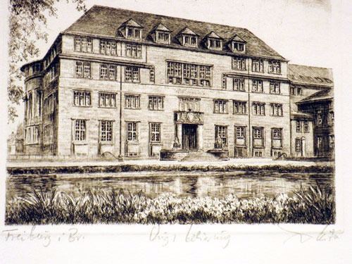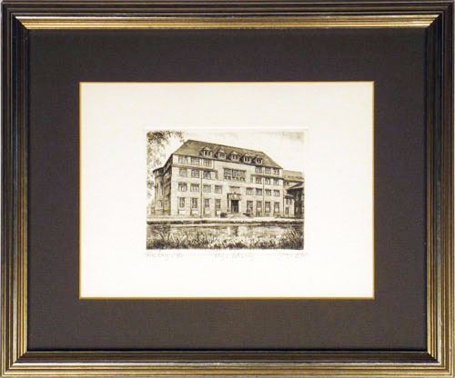 Very Rare Signed Etching of University of Freiburg. Signed Etching. Striking rendition of Kollegiengebude of the university of Freiburg, (officially Albert-Ludwigs-Universitt Freiburg), constructed in 1913 and featuring lovely Art Nouveau elements. Signed Gehering. Very attractively matted and framed. Size: 13X11 inches. Country of Origin: Germnay.