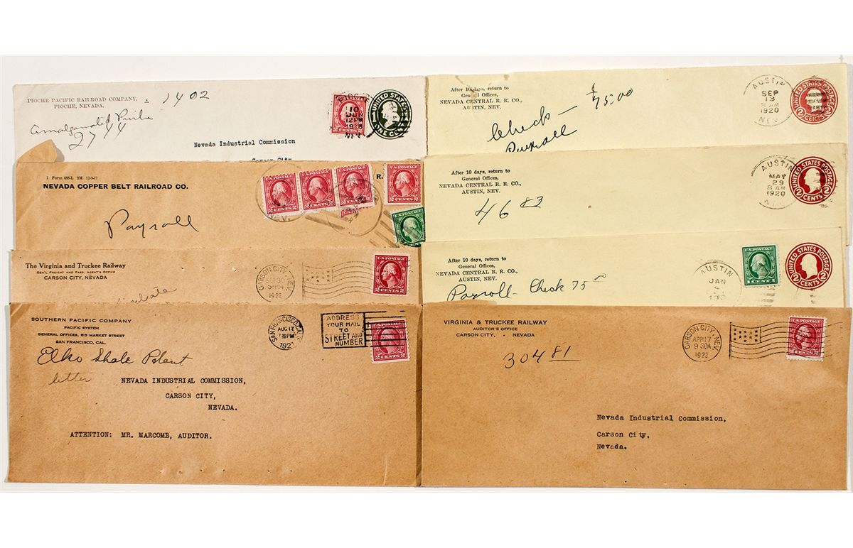 c1918 This lot contains eight covers bearing railroad corner advertising from The Virginia & Truckee and Southern Pacific Railroads. Rarer still are ads from Pioche Pacific Railroad, Nevada Copper Belt Railroad and The Nevada Central Railroad Company. All are in good condition. These are from former Nevada State Treasurer Dan Franks' collection. - HKA#66045