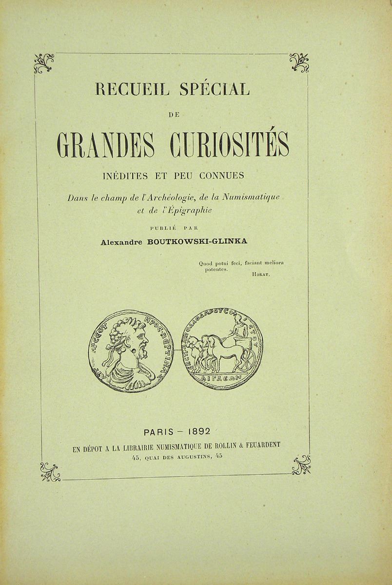 Boutkowski-Glinka, Alexandre. RECUEIL SPÉCIAL DE GRANDES CURIOSITÉS INÉDITES ET PEU CONNUES DANS LE CHAMP DE L'ARCHÉOLOGIE, DE LA NUMISMATIQUE ET DE L'ÉPIGRAPHIE. Paris, 1892. 8vo, original printed wraps. 58, (2) pages; text illustrations. Unopened; fine. A collection of essays, mostly concentrating on ancient coins. Boutkowski (Butkowski, Butkovskii), 1826-1894, is perhaps best known today for his Petit Mionnet (1889). Very scarce.