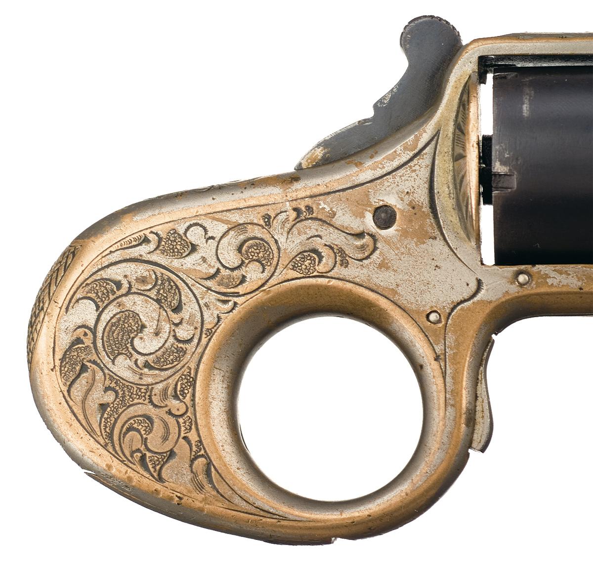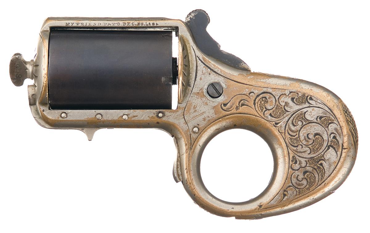 Manufactured from 1870 to 1882 with about 3,100 made in the serial number range of 6570 to 17900. This revolver is a very scarce early variation made with the sliding safety mounted on the bottom of the frame and the trap door in the butt secured by a screw. This trapdoor allowed access to the mainspring for adjustment. The serial number on this revolver would indicate that it is a very early production. The left side of the top strap is marked "MY FRIEND PATD. DEC. 26, 1865". The serial number is marked on the butt and the cylinder pin is marked "86". The brass frame has broad leaf scroll engraving with a punch dot background, with simple patterns on the top strap and a checkered shield and oval on the back of the grip. Blue cylinder and hammer, and silver plated brass frame.