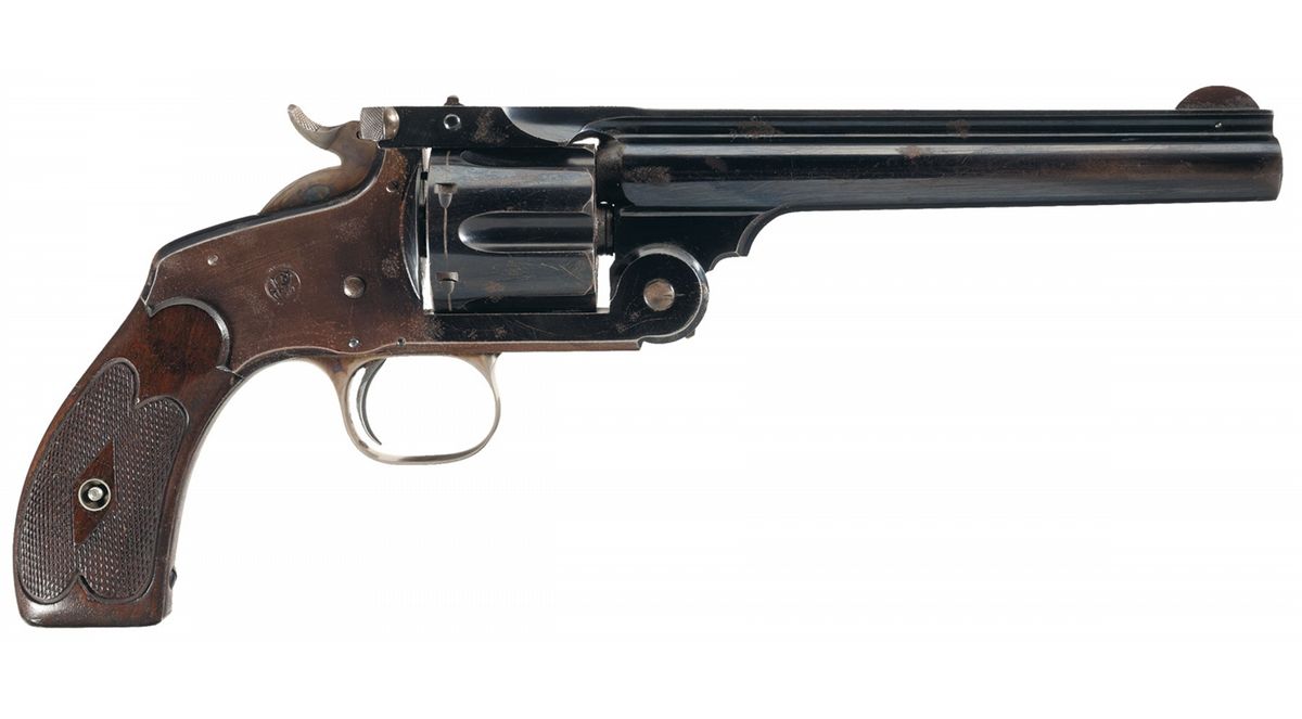 Condition: Fine. The finish loss on this revolver is a result of improper storage, not use and abuse. The revolver exhibits 75% plus original blue finish, showing areas of mixed brown patina, concentrated on the right side and underside of the frame, a few scattered thumb-sized patches of pitting, and mild handling marks. Strong, bright case colors remain on the hammer and triggerguard, with silvering on the remainder. Grips are very good, with minor pressure dents. Mechanically excellent. A hole to fill in even the most advanced S&W collections.