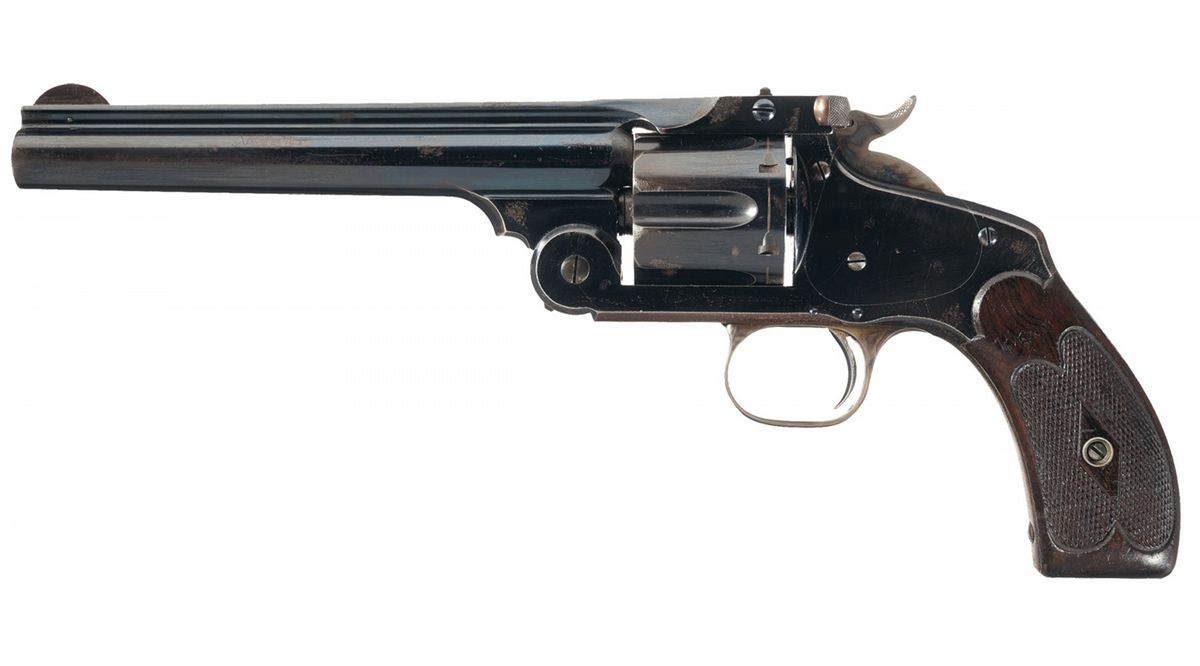 Manufactured in the ultra-rare 38-40 Winchester caliber, of which only 74 total were made. According to the included factory letter, this New Model Number Three Revolver was shipped 19 March 1908 to "Schoverling, Dale & Gale" of 302 Broadway, New York City, in 38-40 Winchester caliber with blue finish, 6 1/2 inch barrel and checkered walnut grips. Presuming "Dale & Gale" is a typo, then the arm was shipped to Schoverling, Daly & Gales of New York City, the firm responsible for establishing the Charles Daly trade name. The 38-40 Winchester was a "dual-purpose" round, marketed for both long guns and revolvers, a field where it was outshone by it's parent cartridge, the 44-40 Winchester. As a result, it was a virtually special order item for the New Model Three, with only 74 made in total as part of an independent serial run, placing this arm near the very end of production. Blade front and notch rear sights, with the one-line, Maltese cross flanked address on top of the rib and matching numbers on the latch, barrel, cylinder and butt. The hammer and triggerguard are casehardened, with factory checkered walnut grips. Provenance: The Gary Garbrecht Collection.