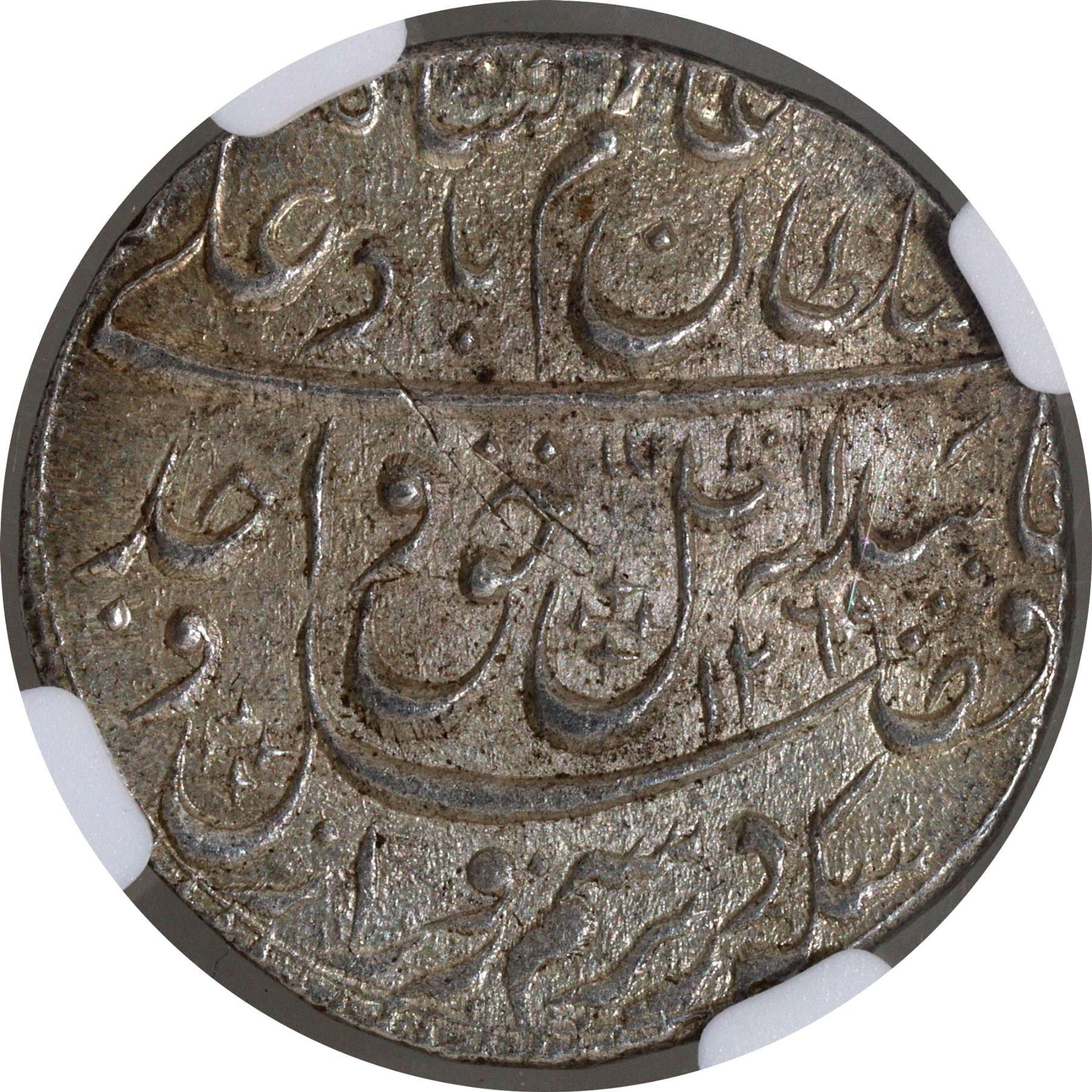 Awadh State, Wajid Ali Shah (AH 1263-1272/1847-1856), Bait-us-Sultanat Lakhnau Mulk Awadh Akhtarnagar Mint, Silver Rupee, AH 1269/6 RY, "Tayed-e-Elah, Zille Haque" Couplet, Obv: Persian legend "sikka zad bar seem wa zar az fazl tayed-e-elah, zille Haque Wajid Ali sultan-e- Alam Badshah" with Hijri year 1269, Rev: a parasol above a crown and crossed swords below, flanked by mermaids holding flags, Persian legend "zarb Bait us sultana Lakhnau Mulk Awadh Akhtarnagar sana 6 julus maimant manus", (KM # 365.3/MK # 11.48), graded & slabbed by NGC as MS65, Extremely Rare in this grade.