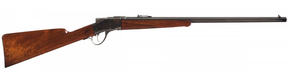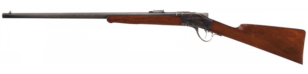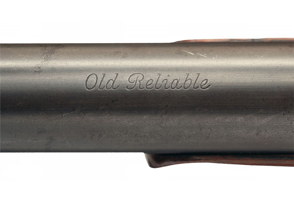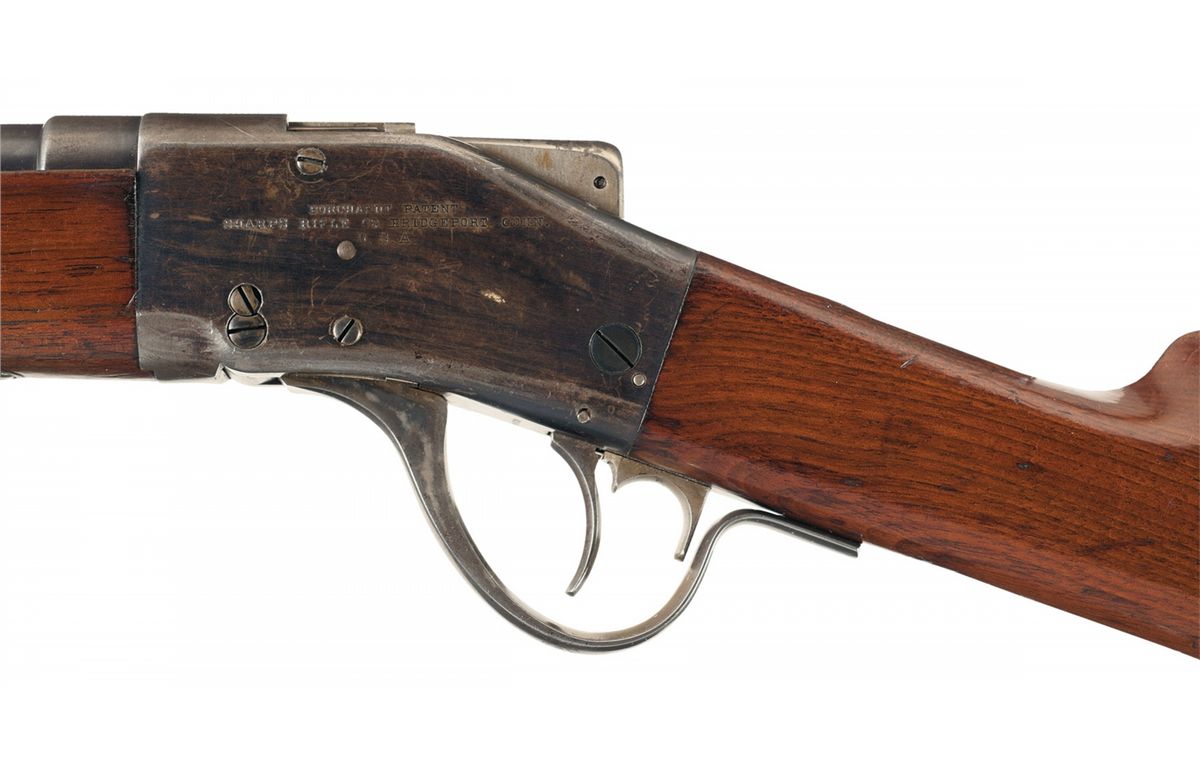 Made circa 1878 - 1881, this is one of approximately 62 Hunters Rifles produced by Sharps. Fitted with a dovetailed silver blade front sight and a 800 yard folding ladder rear sight, with the top of the barrel marked "Old Reliable", "SHARPS RIFLE CO. BRIDGEPORT. CONN." and "CALIBRE 40" along the top, with "1 1/16" on the right side of the breech. Falling block receiver with casehardened lever and automatic safety, marked "BORCHARDT PATENT/SHARPS RIFLE CO. BRIDGEPORT CONN./U.S.A." on the left side. Smooth Schnabel tip forearm and straight grip stock with a checkered iron buttplate.
