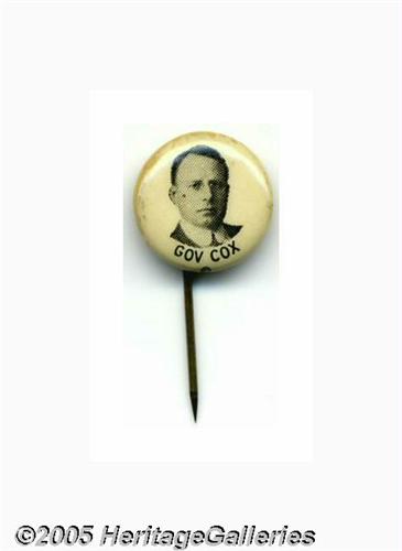 <B>Very Scarce Tiny 1/2" James Cox Button</B></I> "Gov. Cox," with familiar portrait above. Light even perimeter staining looks like shading and detracts minimally. Lot:262