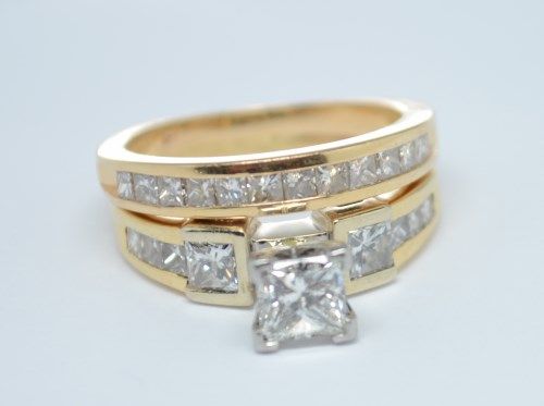 Complete set weights Approx. 2.0ctw. Center stone measures .75, It appears to be I1 in Clarity and H-J Color. Both rings are solderered together and are a size 4 1/2. Estimated at $5500.00 - $6000.00