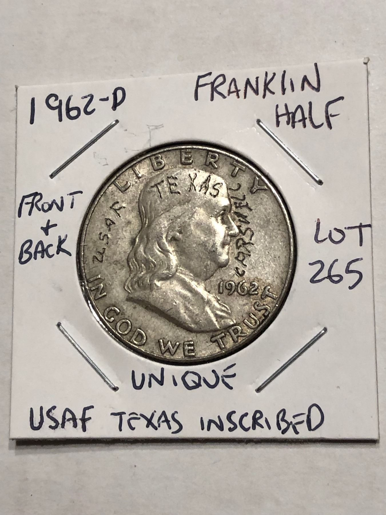 Very Unique Inscribed 1962 D Silver Franklin Half Dollar USAF TEXAS Front and Back Inscriptions