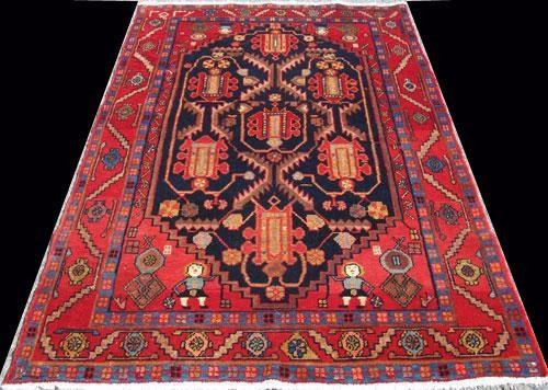 Very Unusual and Attractive Fine handmade Persian Mission-Malayer Rug. 100% Natural, vegetable dye, hand woven, hand spun baby lambs wool piles on cotton foundation. Mission is a hamlet in the proximity of the town of Malayer. Malayer is a town in the western region of Iran. Mission-Malayer Rugs display uniqueness in the broad range of designs and choices of colors. They are true artistic creations, and their value reflects their artistry. Mission-Malayer Rug production has always been few and far in between and therefor very much desirable, sought after and popular among the collectors. This lovely piece is a vintage mid-20th century in mint condition. The contrasting rich navy blue background against the soft red border and a charming pattern including the human figures are quite captivating. Size: 7 feet 3 inches X 4 feet 7 inches. Country of Origin: Iran.