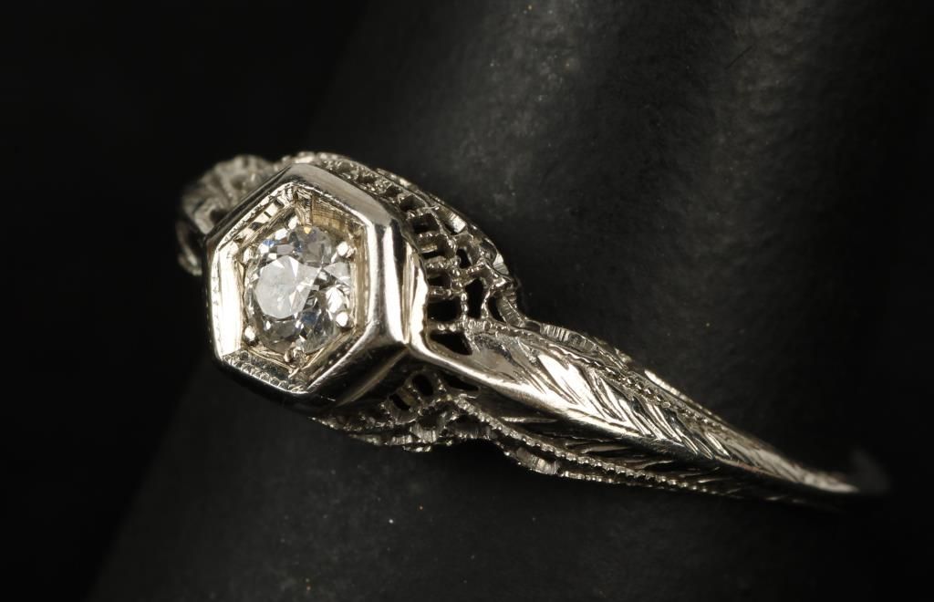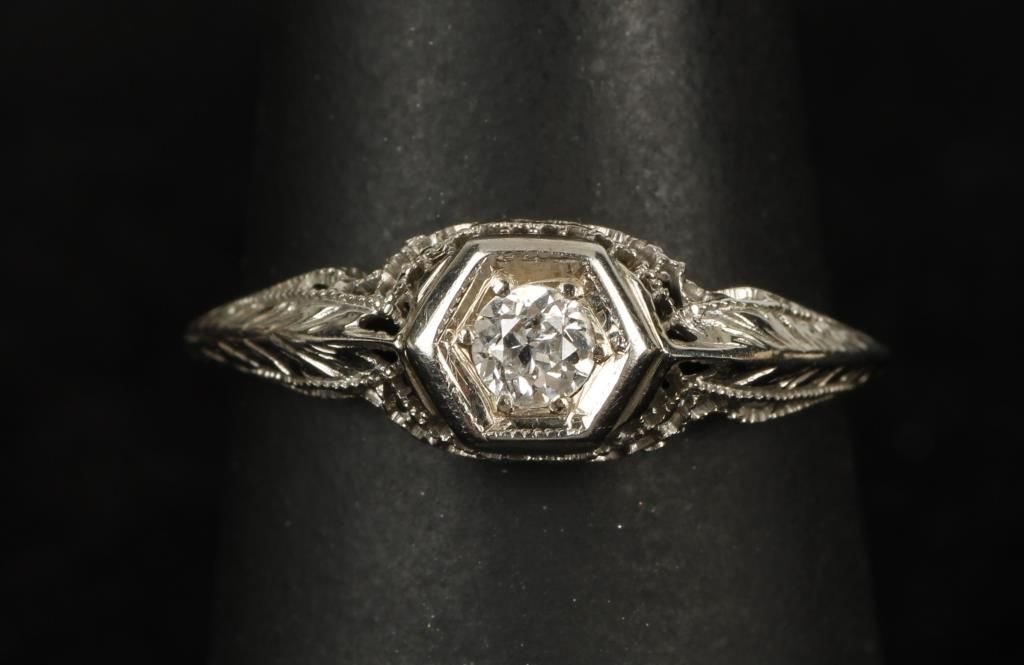 The diamond is approximately 0.11 ct, old European cut, S12, G in color. Features lovely filigree work on the ring. The ring is size 6 and weighs 1.2 grams.