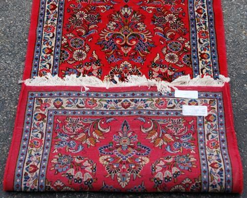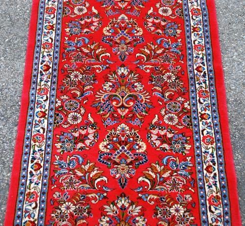 100% natural, vegetable dye, hand woven, worsted wool pile on cotton foundation. This beautiful Runner Rug features classic rounded vine scrolls and lavish arabesques as well as local bouquet filled designs that represent the diversity of regional carpet-weaving traditions. very beautiful allover floral design authentic Persian Sarouk Runner. Made of fine quality lamb and wool pile on cotton foundation, all natural vegetable dye, this lovely runner incorporates a beautiful allover floral pattern on a rich red background and is framed beautifully by an intricately done floral border. Hand woven in Sarouk. As a result of the handmade weaving process, not all sides may be straight or corners square. Size: 9 feet 9 inches X 2 feet 7 inches. Country of origin: Iran.