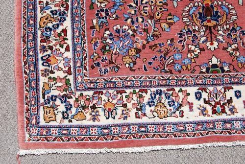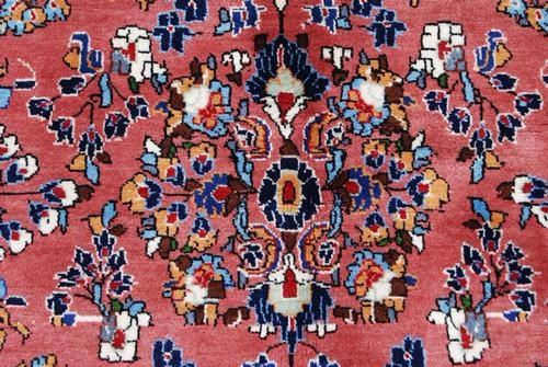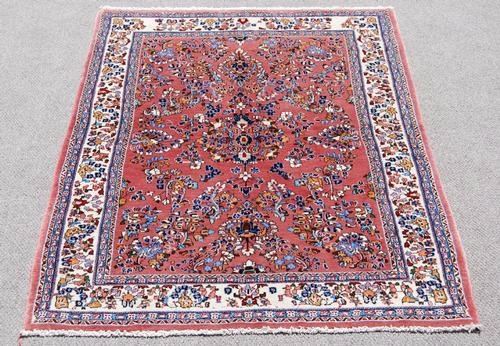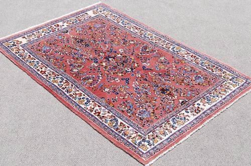Very beautiful flowing floral medallion Persian Sarouk Rug. Made of fine quality lamb's wool pile on cotton foundation, all natural vegetable dye, incorporating a flowing floral medallion on a red colored background; and contrasted beautifully by an intricately done floral border. Hand woven in City of Sarouk from Iran. About Sarouk Rugs: the thickness of the luxurious pile allows Sarouk Rugs to withstand the level of foot traffic that would be typical in hallways, common rooms and foyers. The style, quality and durability of Sarouk Rugs have made them extremely popular with western consumers then and now. Sarouk carpets derive their name from an obscure village in persia, located twenty miles north of arak formerly sultanabad. Over a short span of history, this village produced some of the most highly regarded Persian weavings of the late 19th to early 20th century. These Rugs are easily recognizable despite their lack of consistent design elements. Most were room sized with central medallions and generally the wefts were blue. The field colors were cream, indigo or a pale red and floral motifs in the field showed multiply shades of orange, green and brown. The short velvet like pile is of excellent quality and wears well. Size: 4 feet 11 inches X 7 feet 2 inches.