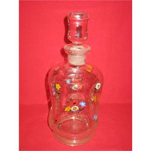 We are offering this beautiful handpainted with Enamel Decanter in perfect condition. It is in a shape of pinch bottle but it is not pinch bottle. It is Enamel painted and bubbles in the glass. H:8.75" to the top of the stopper. W:3.50"